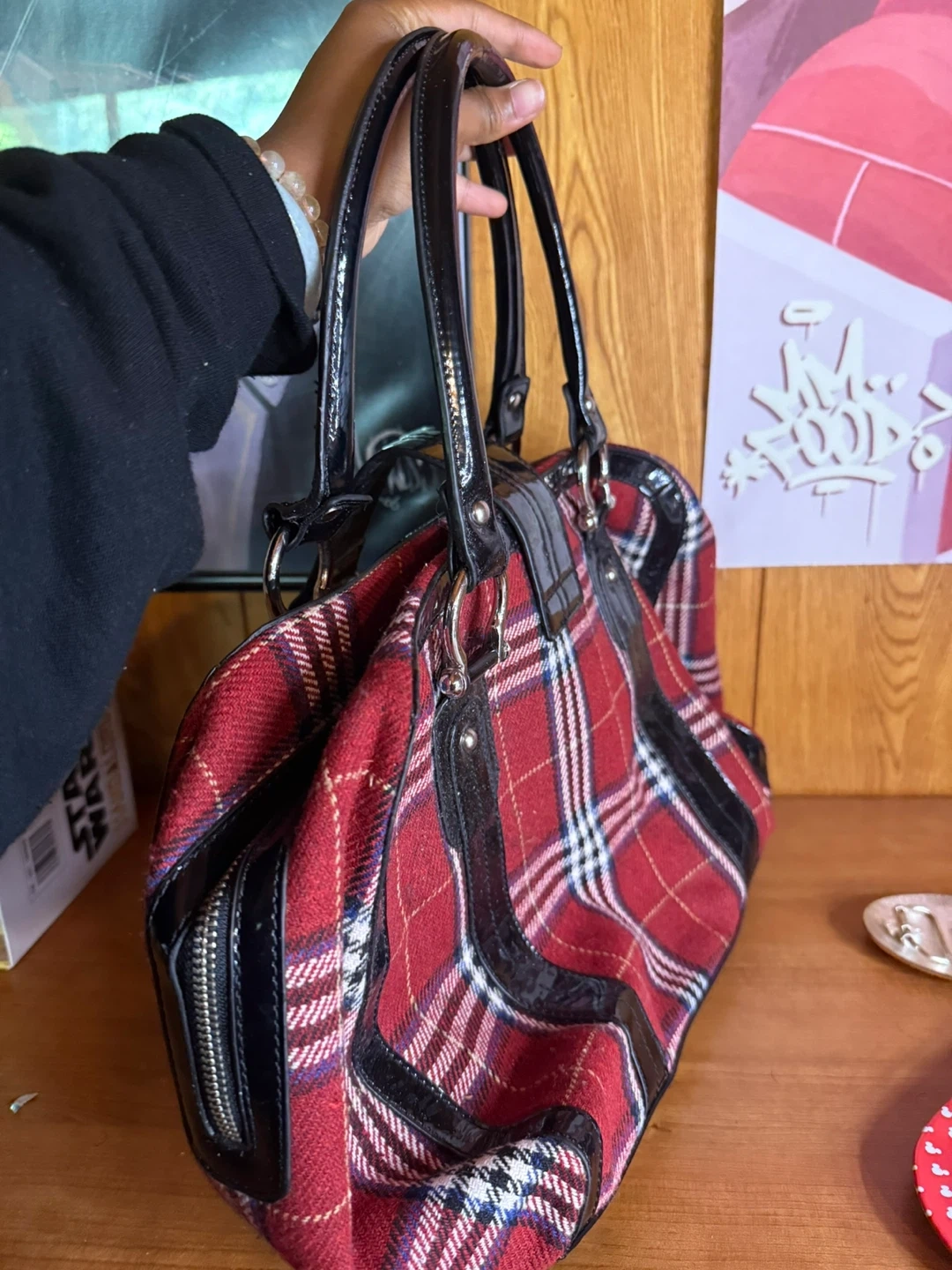 A stylish handbag with a plaid pattern and shiny black patent leather trim. It features silver hardware and a unique flap closure. Perfect for adding a touch of sophistication to your outfit!