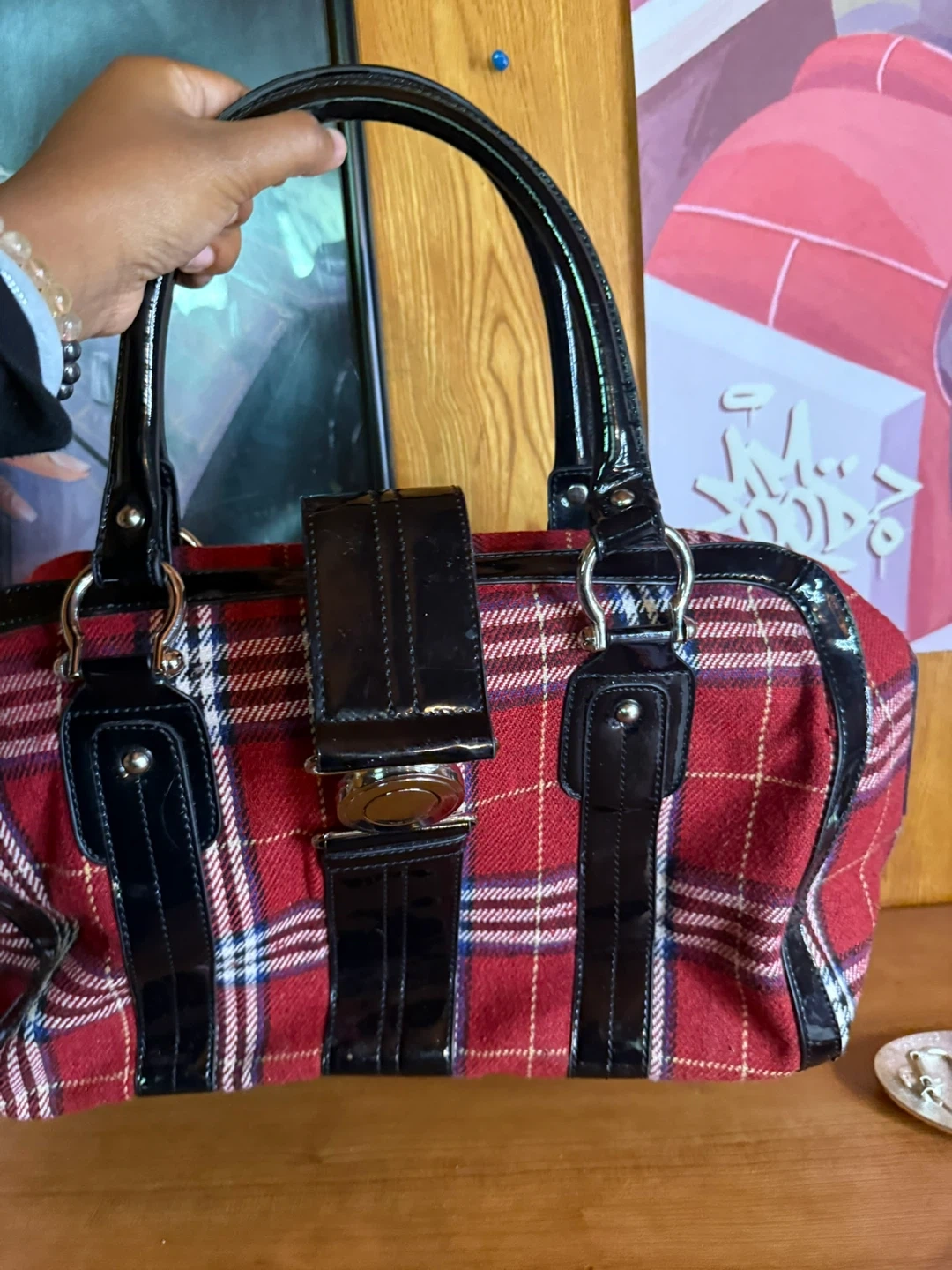 A stylish handbag with a plaid pattern and shiny black patent leather trim. It features silver hardware and a unique flap closure. Perfect for adding a touch of sophistication to your outfit!