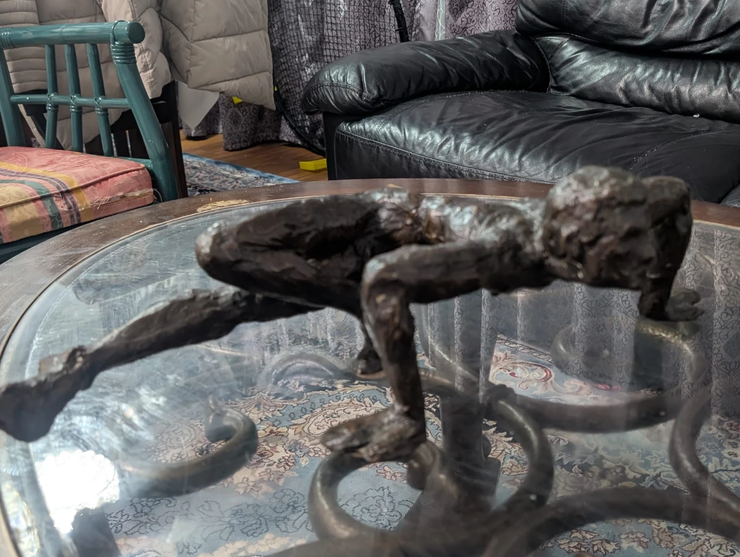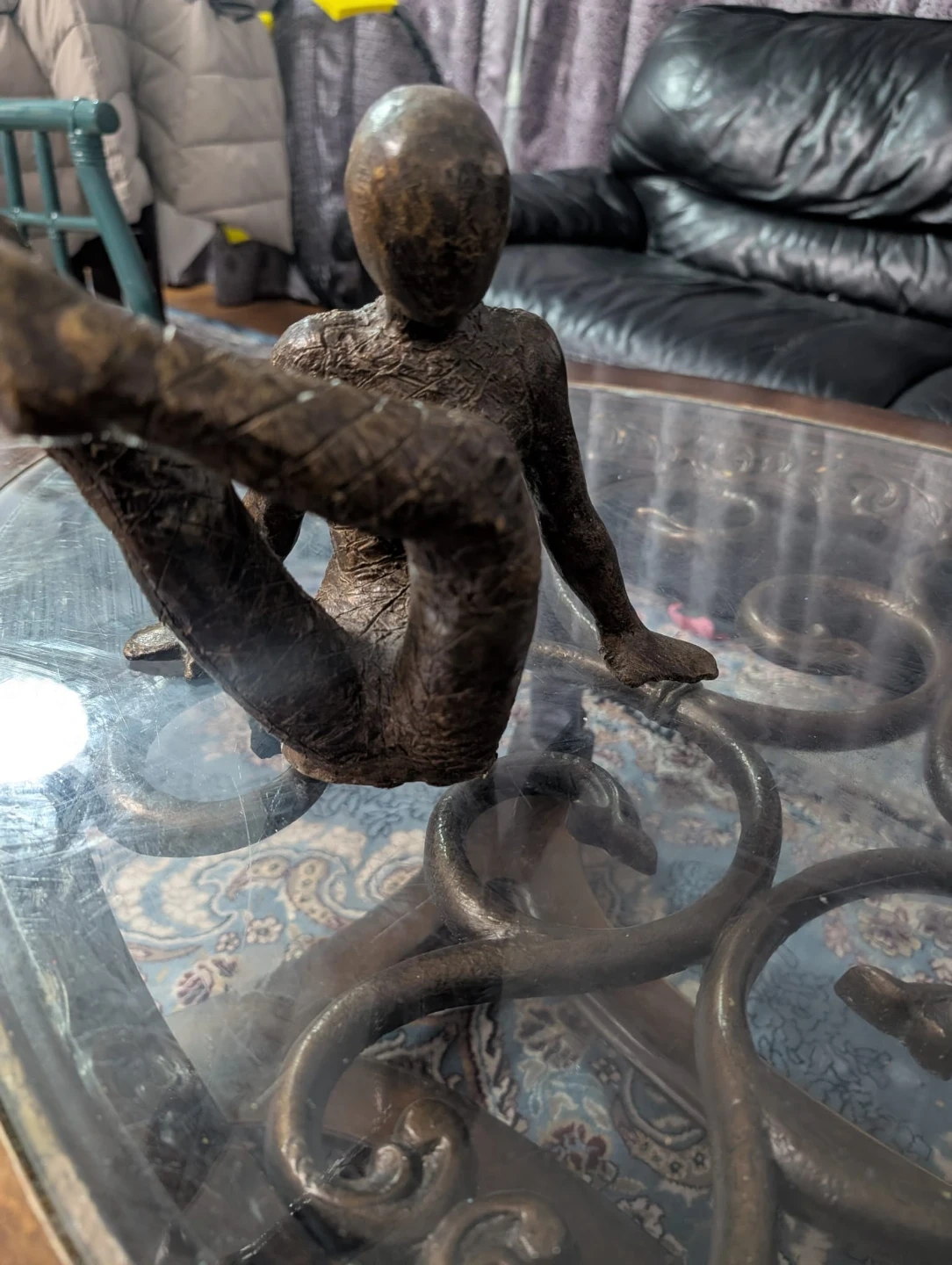 This is a dark bronze abstract sculpture of a human figure in a dynamic pose. The textured finish gives it a unique artistic look. It's suitable for display on a shelf or table as a statement piece.