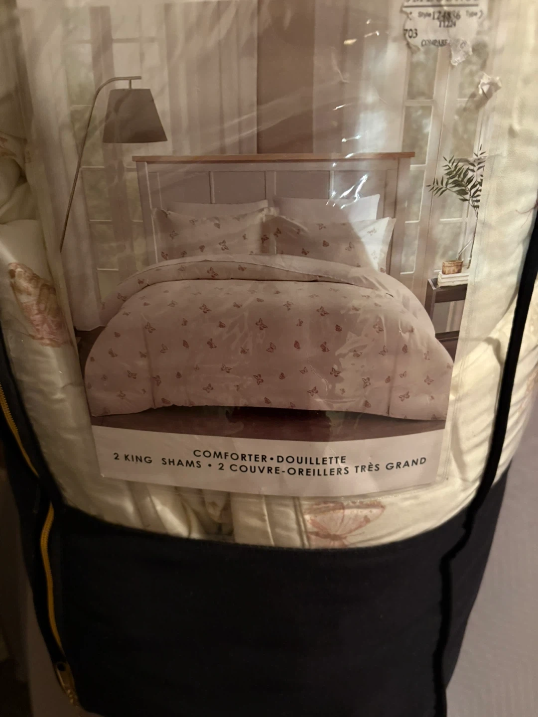 This is a king-sized comforter and two sham set. It features a delicate butterfly pattern all over. The material is soft and comfortable for a cozy bedroom.