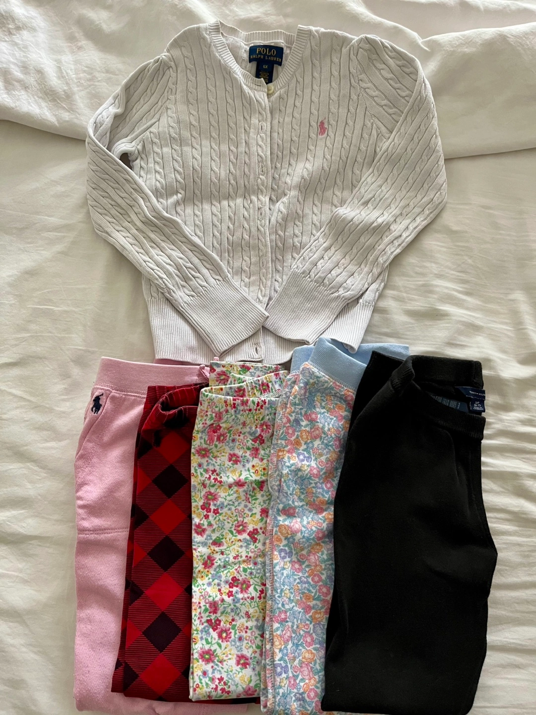 Includes a cable knit cardigan and several pairs of pants, some of which are patterned. This selection is perfect for putting together a comfortable, coordinated outfit for a little one.