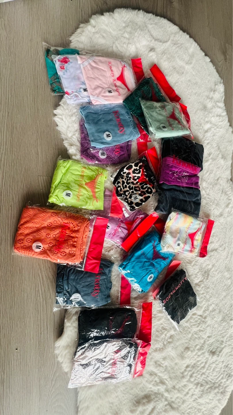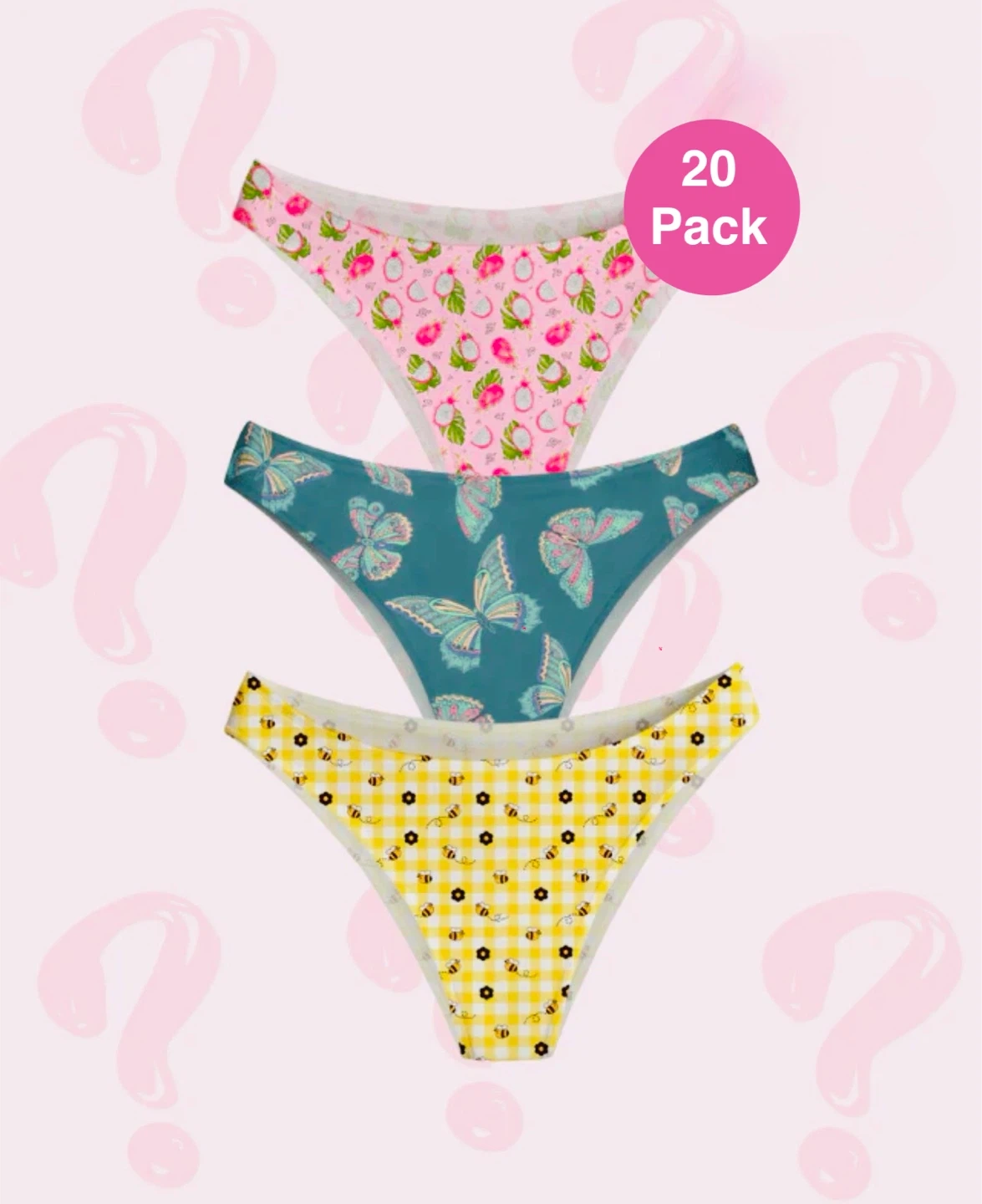 A 20-pack of assorted women's underwear. Includes various patterns like floral, butterflies, bees, gingham, leopard print, and solid colours. Size M.