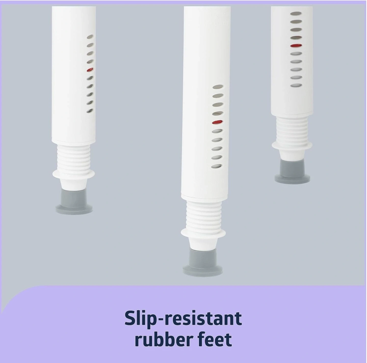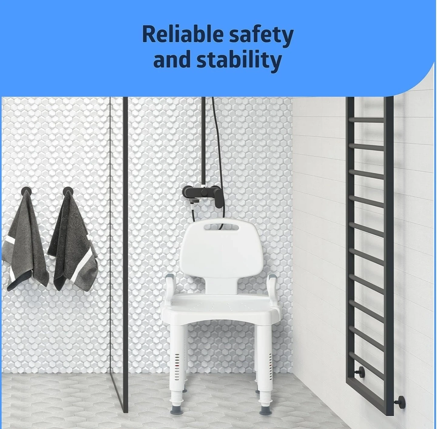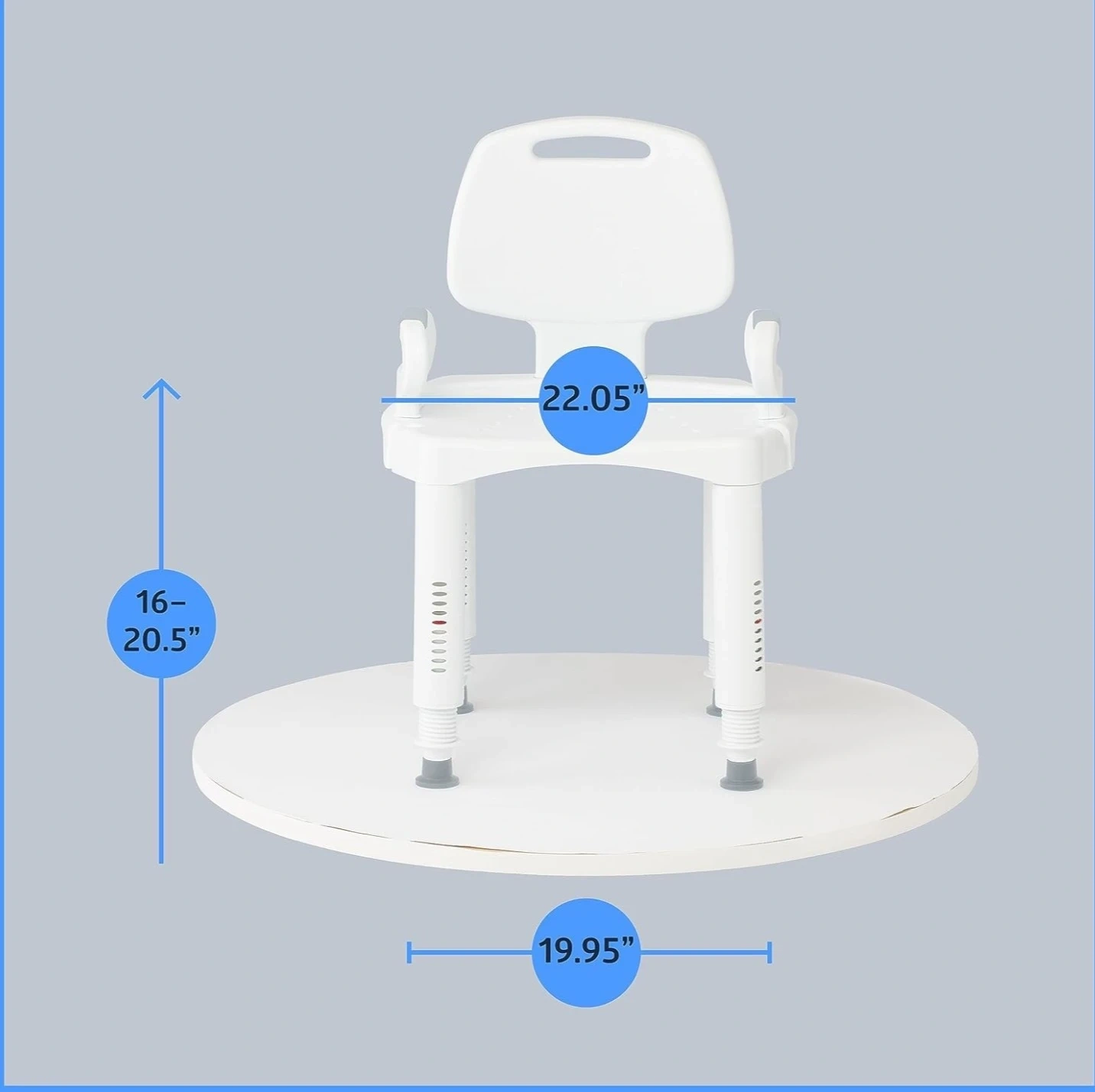 White shower chair with adjustable height legs and non-slip rubber feet. It features armrests and a backrest for added support. Width is 22.05 inches, and the seat height adjusts from 16 to 20.5 inches.