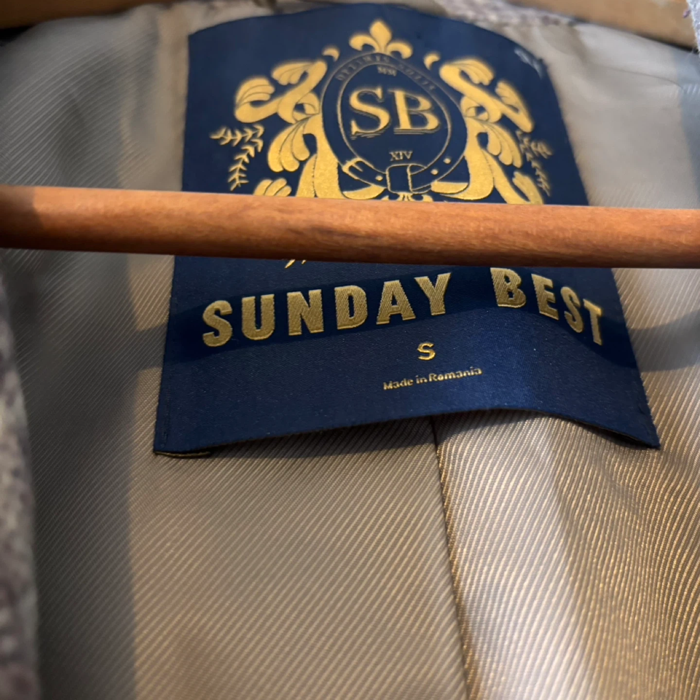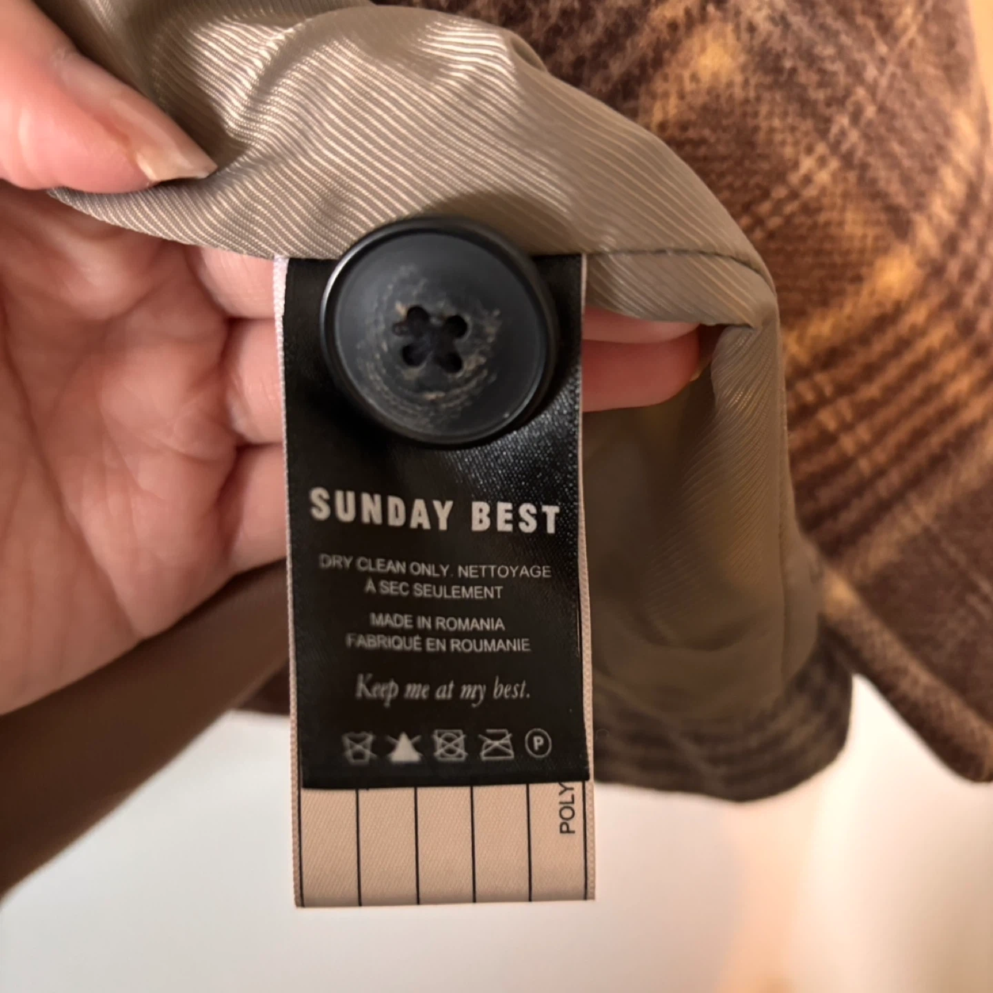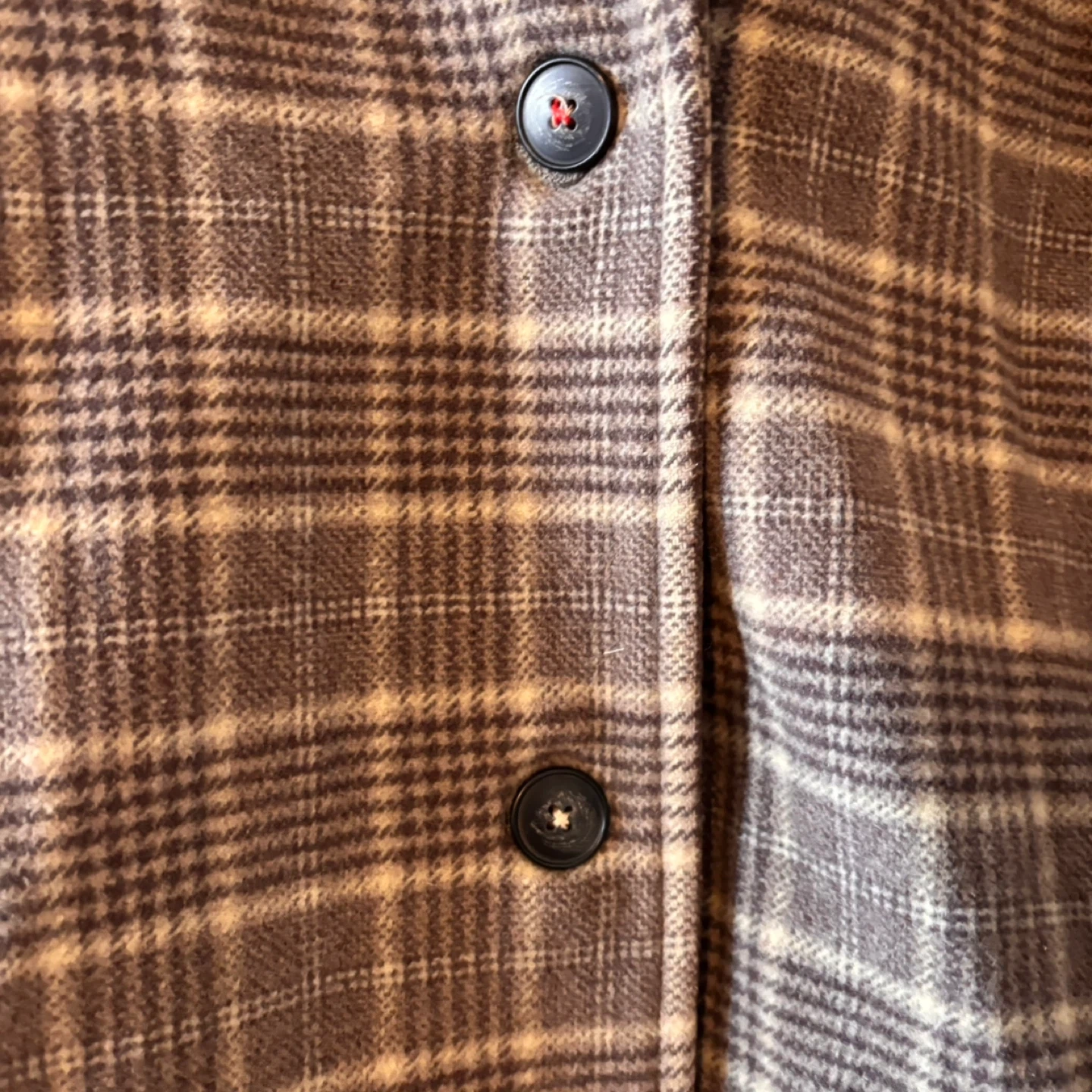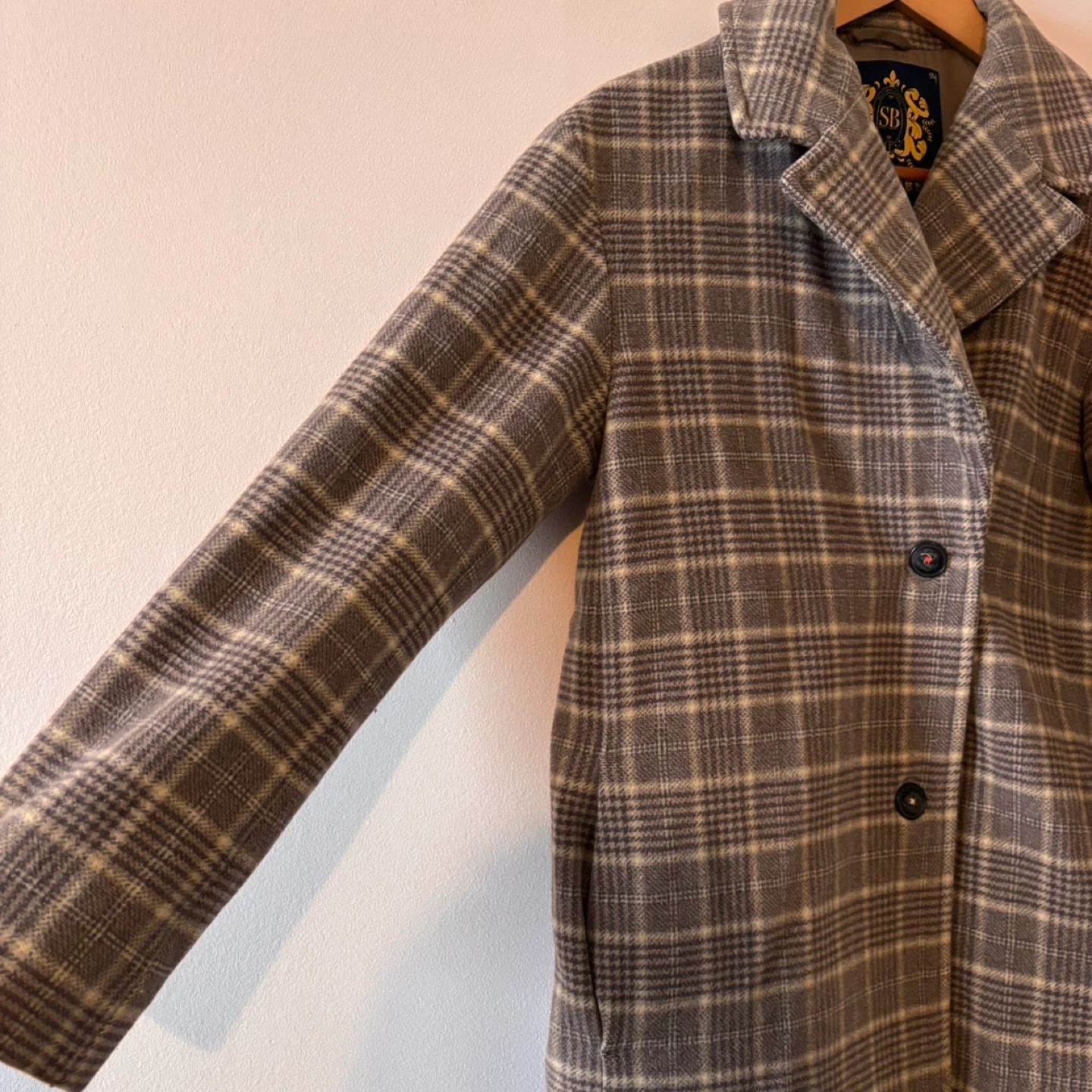 Its size small and made in Romania. Features a classic plaid pattern with two buttons and pockets.