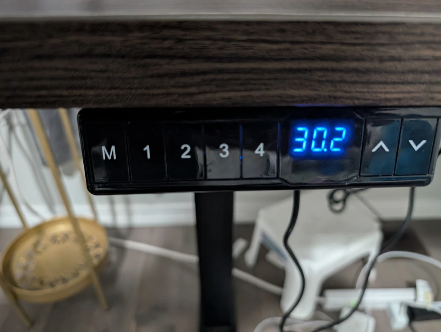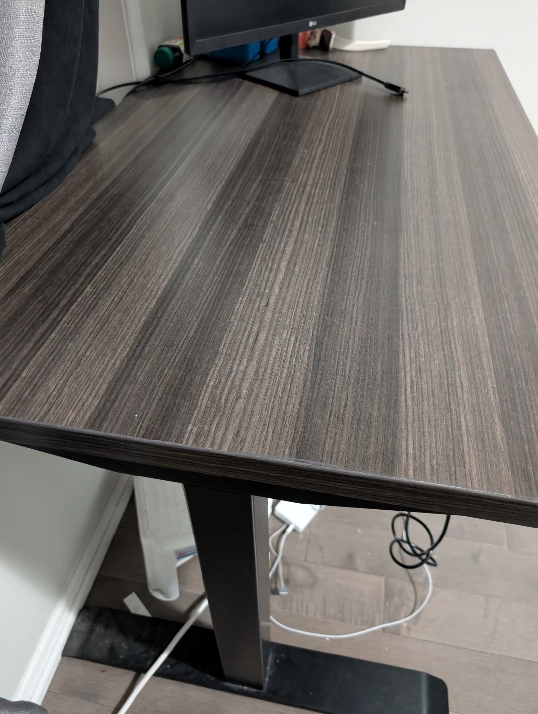 This adjustable height standing desk features a modern dark wood laminate top and a sturdy black metal frame. It includes a digital controller with memory presets for easy height adjustments. Perfect for creating a more ergonomic workspace at home or in the office!