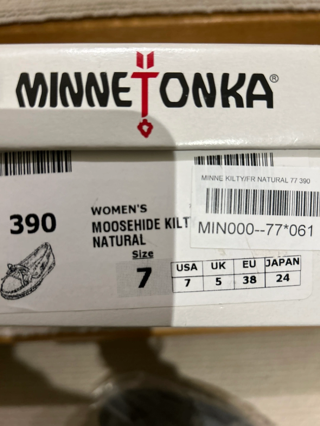 Genuine moosehide man made moccasins. Rubber soles. Women's size 7. Natural colour. New in box.