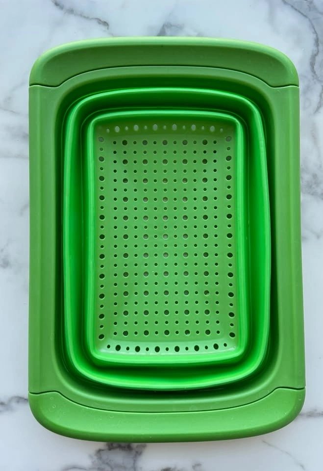 - Expandable Rectangular Sink Colander with a collapsible TPR material design that adjusts to fit your sink.