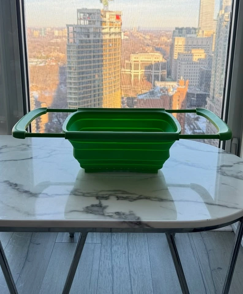 - Expandable Rectangular Sink Colander with a collapsible TPR material design that adjusts to fit your sink.