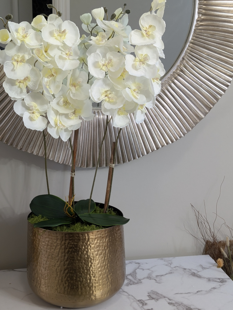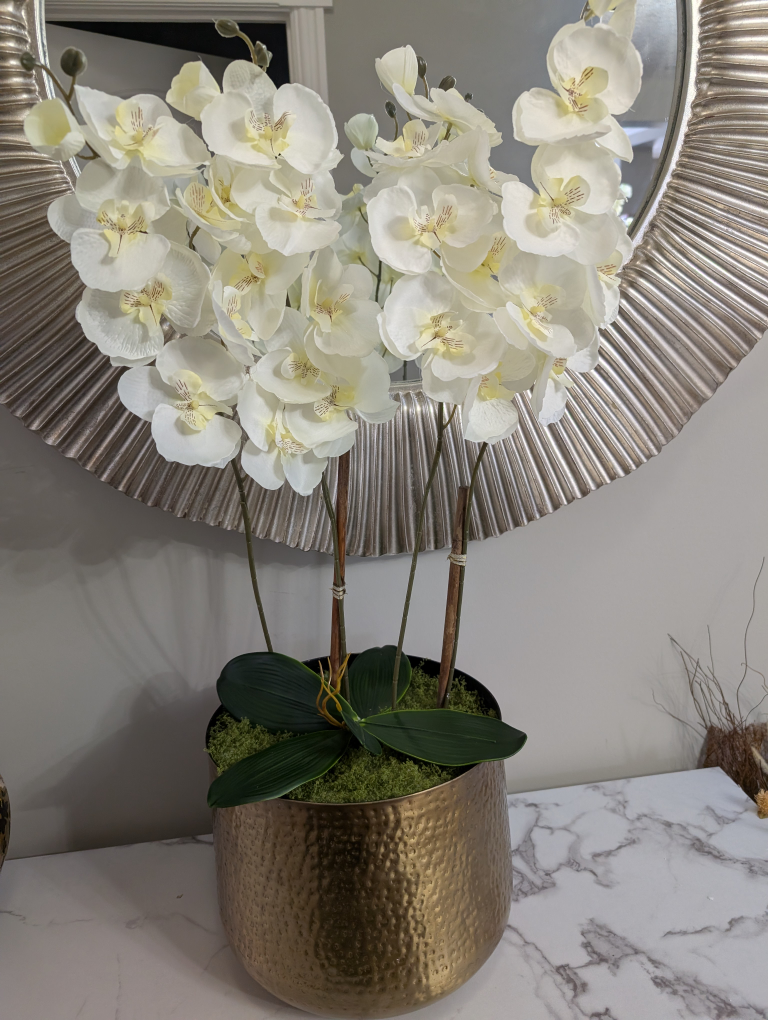 Beautiful artificial orchid arrangement. Cream-coloured flowers in a gold hammered metal pot. Perfect for home décor. Adds elegance to any room.