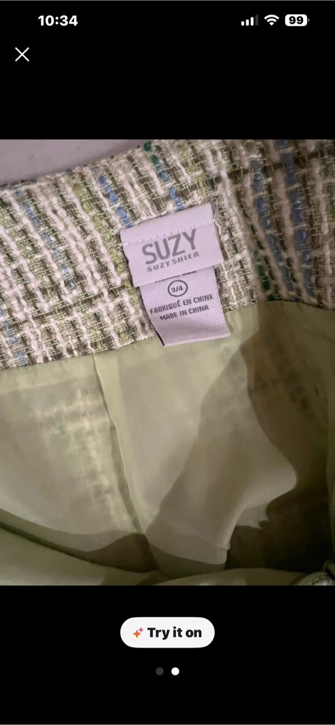 This Suzy Shier tweed skirt features a green and white plaid pattern with blue accents. It has a flounced hem and a size 3/4 tag. Made in China.worn once