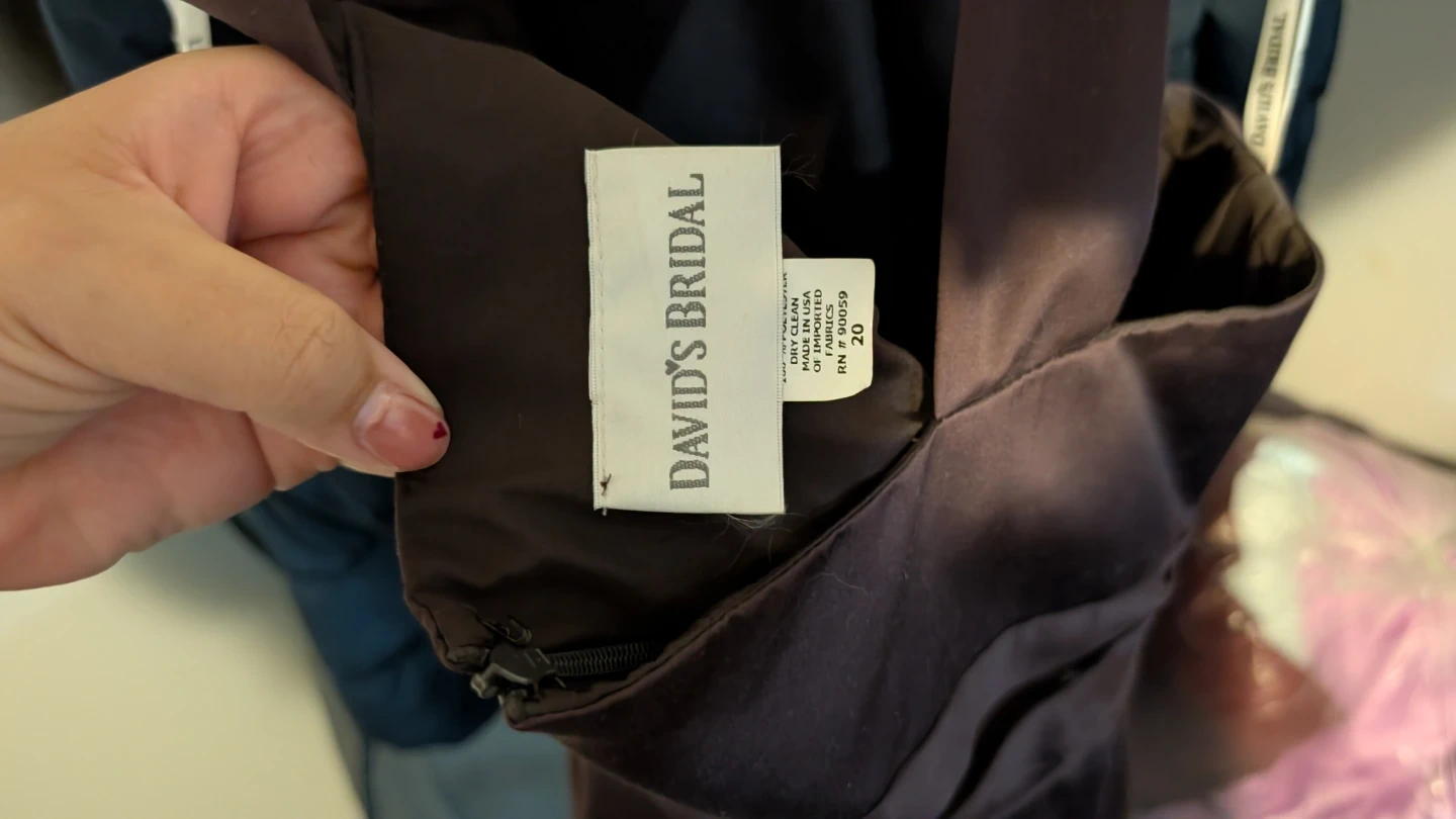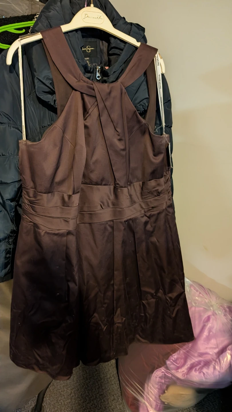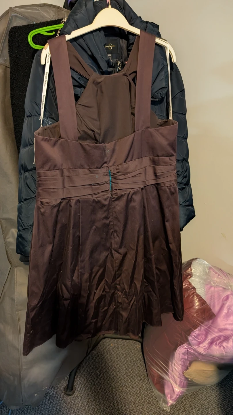 David's Bridal dress in a rich brown satin. It features a flattering A-line silhouette and a unique halter neckline. Size 20. never worn. Was altered to have a sash which was removed