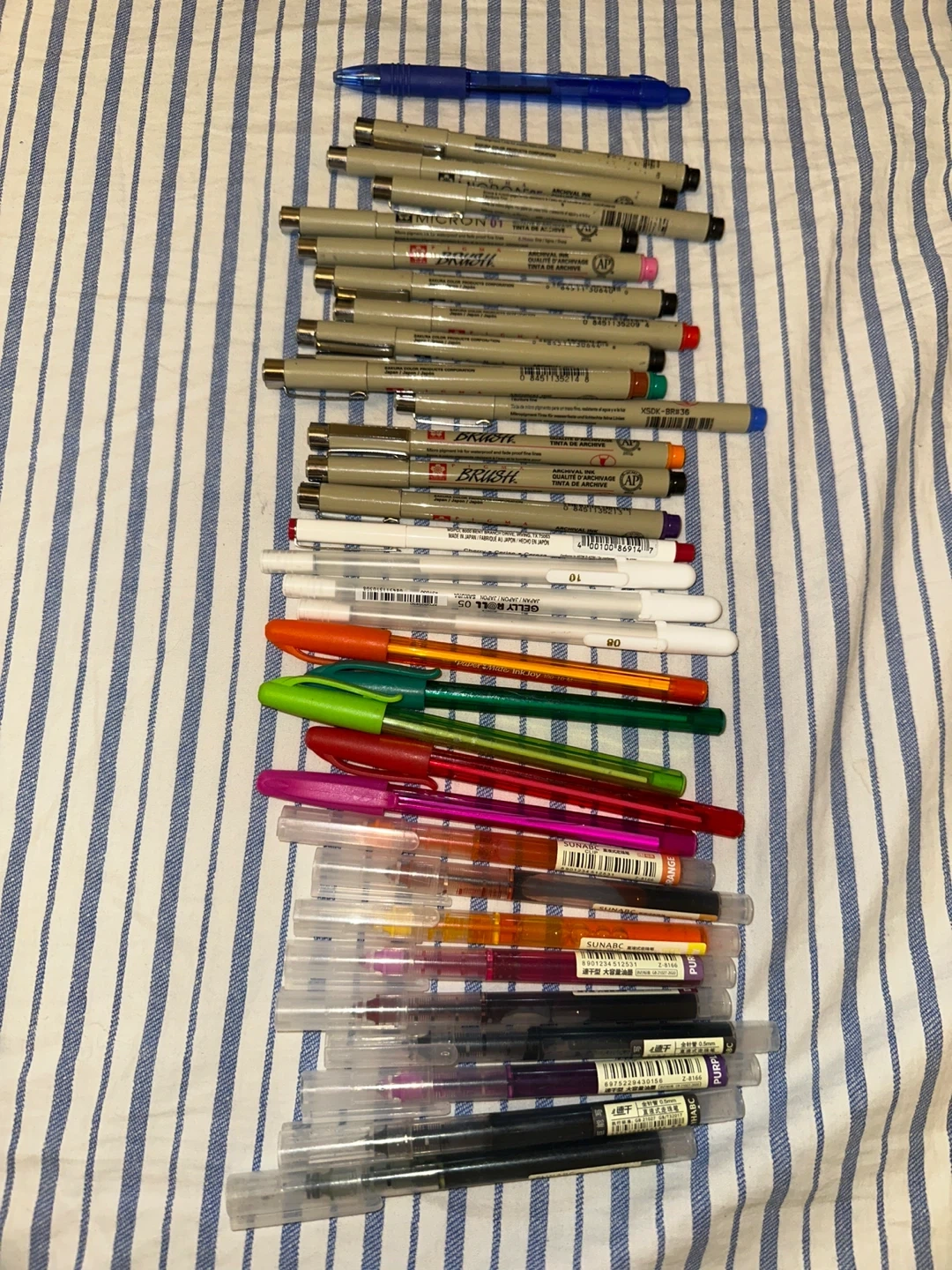 This is a collection of various pens and markers, including Micron technical pens and Sunabc gel pens. You'll find a range of colours and tip sizes for all your writing and drawing needs. These are great for artists and students alike! Like new, can test on notepad before purchase.