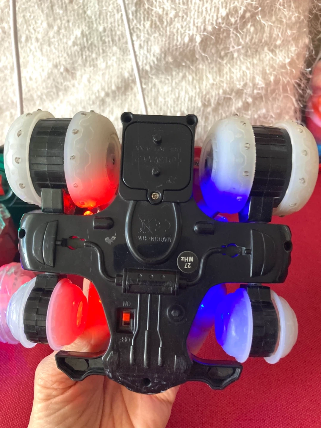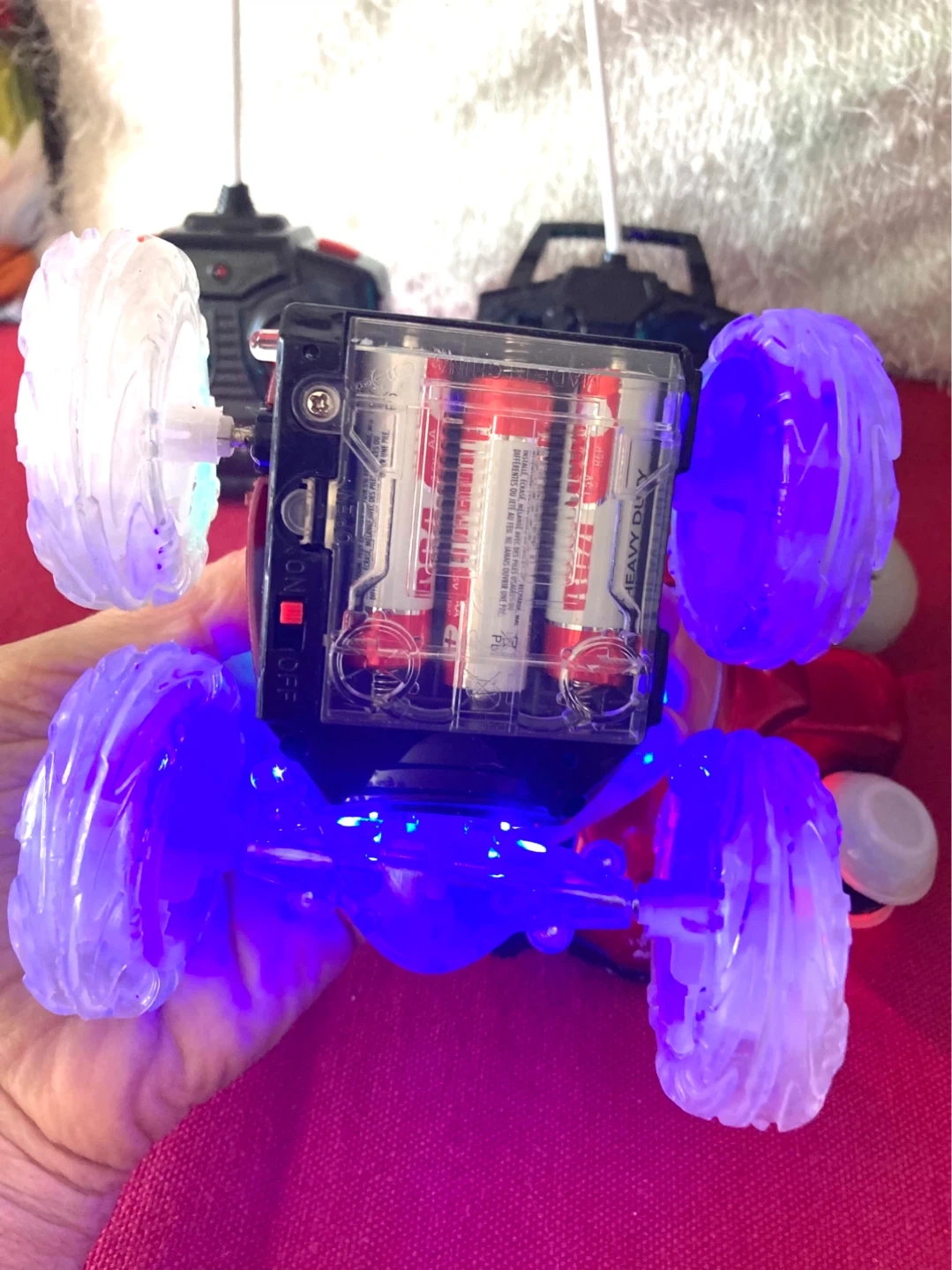 Price for both!! This remote-controlled cars features bright LED lights and a unique design. It's built for fun with its spinning action. Requires batteries for operation. The car lights are turned on that’s why look in a funny illumination.
