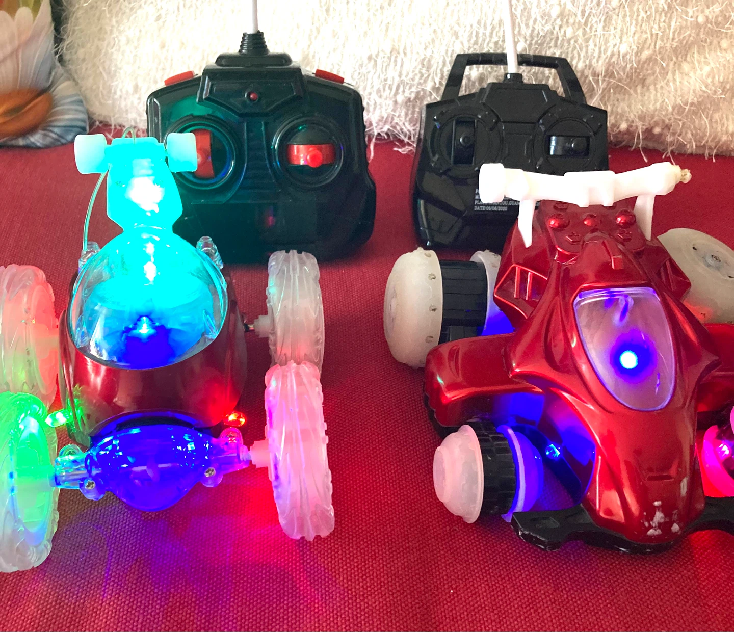 Price for both!! This remote-controlled cars features bright LED lights and a unique design. It's built for fun with its spinning action. Requires batteries for operation. The car lights are turned on that’s why look in a funny illumination.
