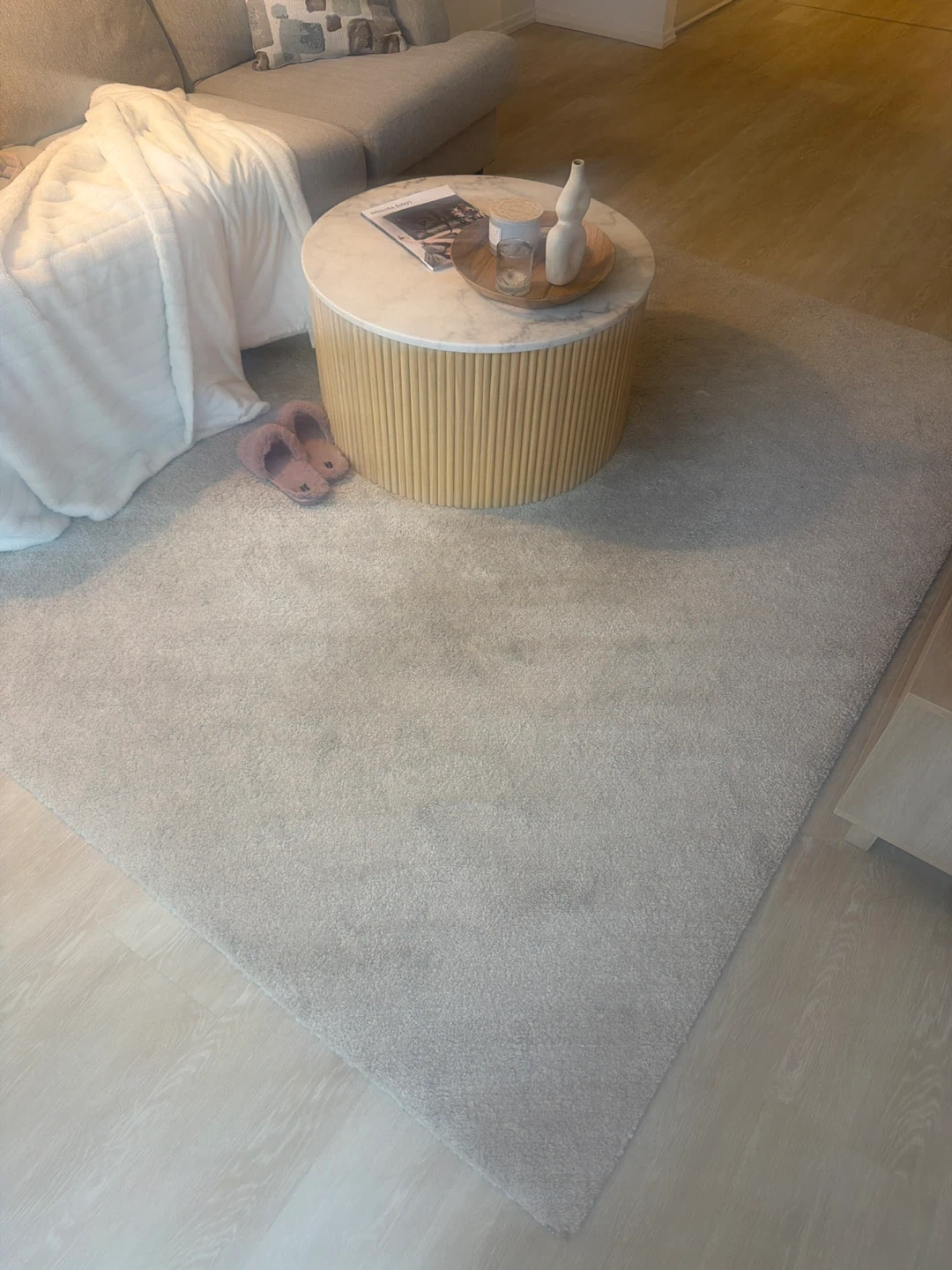 Used for about one year, very comfortable and no stains. Perfect if you’re looking for a light, elegant rug that brightens the space.