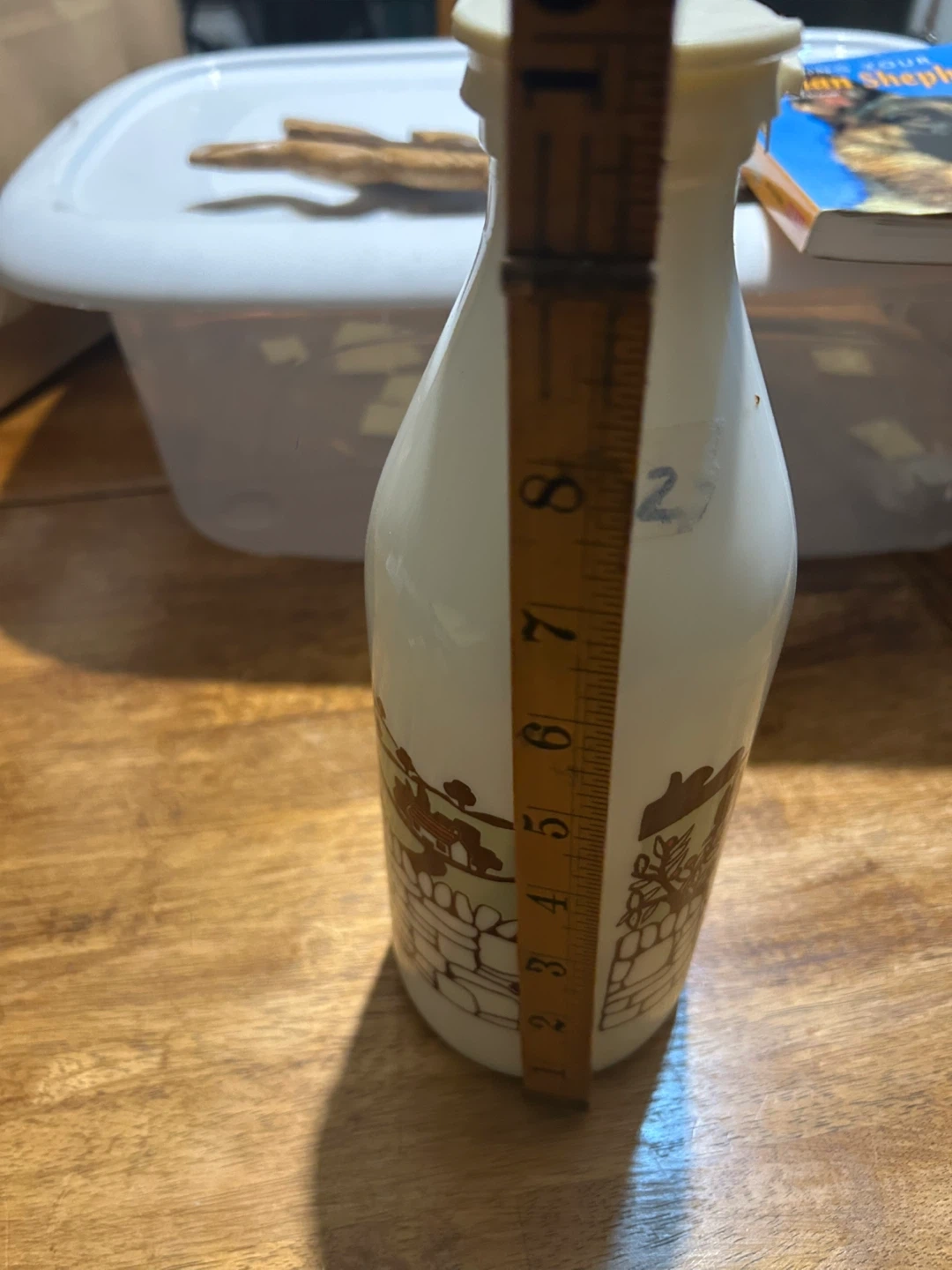 This is a white ceramic creamer jug featuring a charming brown farm scene design. It measures approximately 7 inches tall. It's perfect for serving cream or milk at your table.