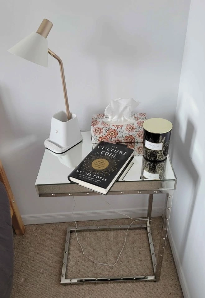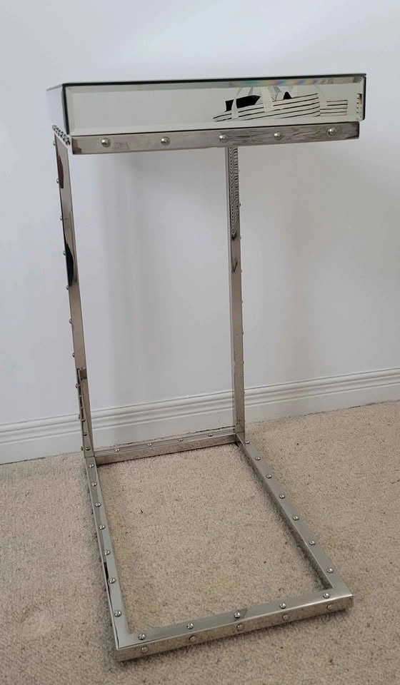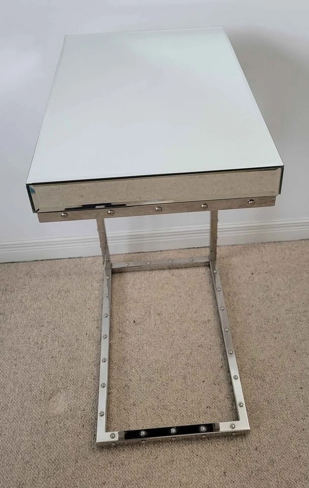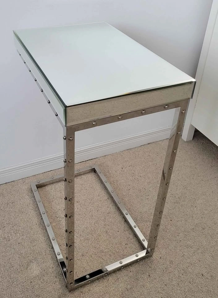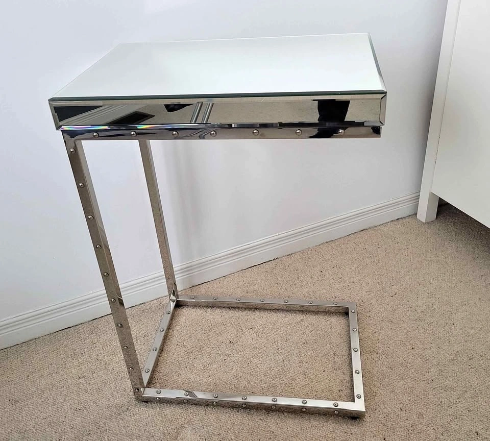 Sleek and functional C-shaped accent table! Beautiful mirror and metal material. Can be used as an end table or night stand. From a pet free and smoke free home. Dimensions: 18.5L x 12W x 26H. Pickup in Orleans, K1C.