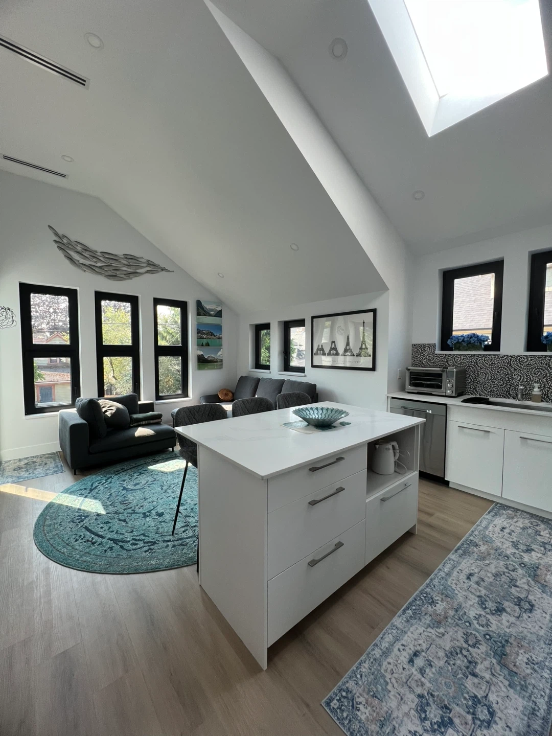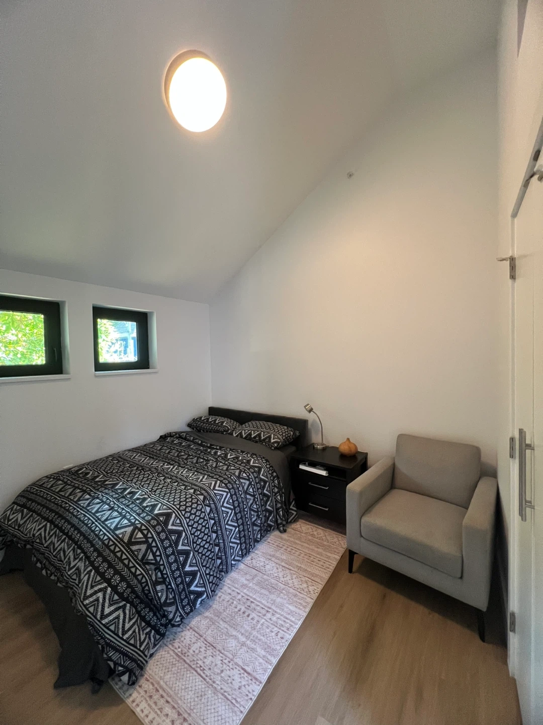 The space includes a cozy living room, fully equipped kitchen, laundry, one bedroom with queen bed and one with double bed and pull out sofabed. Utilities included.