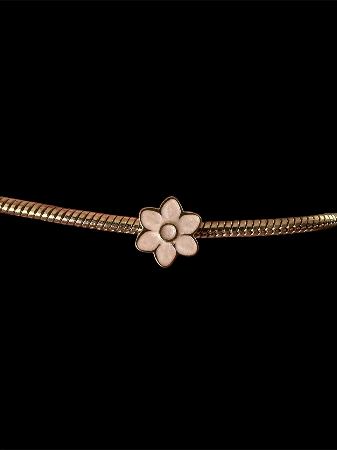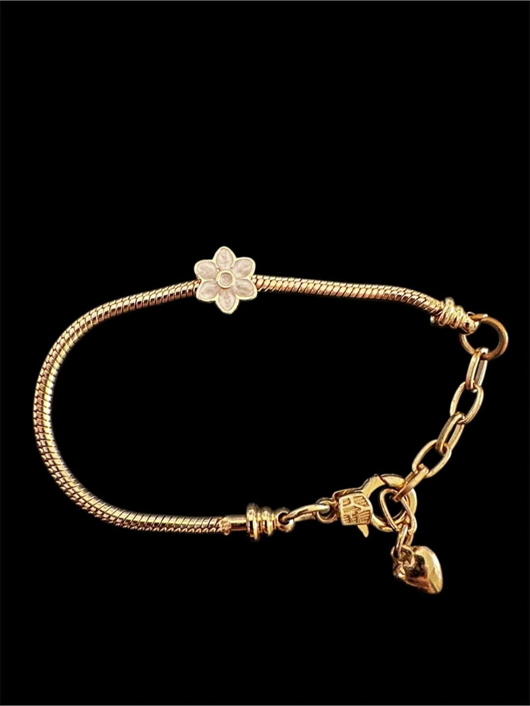 Stainless steel gold tone bracelet with a flower charm! The bracelet has a lobster clasp and a small heart charm on the chain. Comes with box.