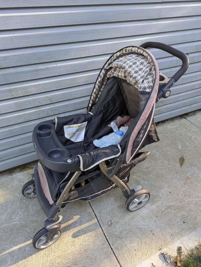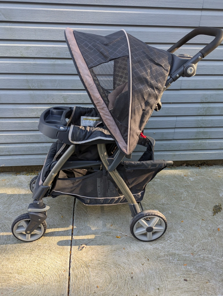Stroller in great condition, neutral grey-brown colour scheme. Large storage basket underneath. Adjustable backrest can lay almost flat. Folds easily, rolls and turns very well, no complaints!