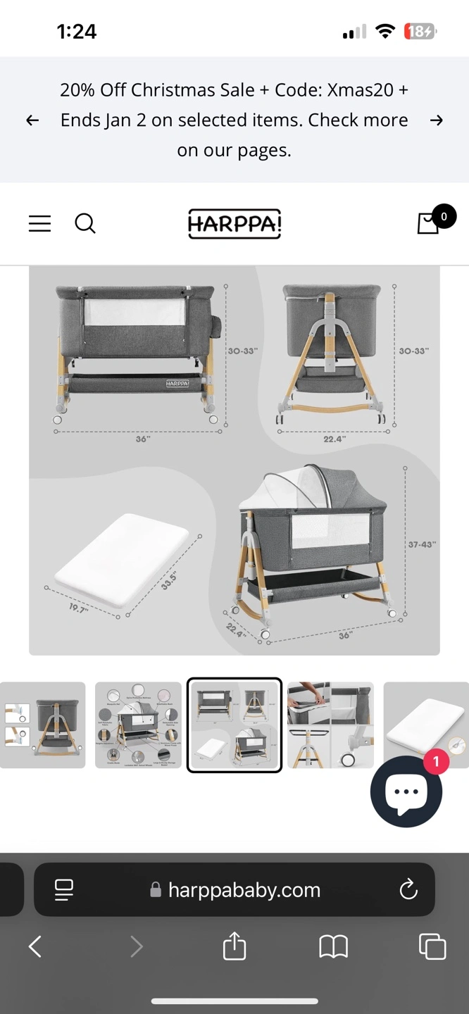 Gray fabric bassinet with wooden frame. Features rocking mode, adjustable height, 360-degree swivel wheels, and a large storage basket.