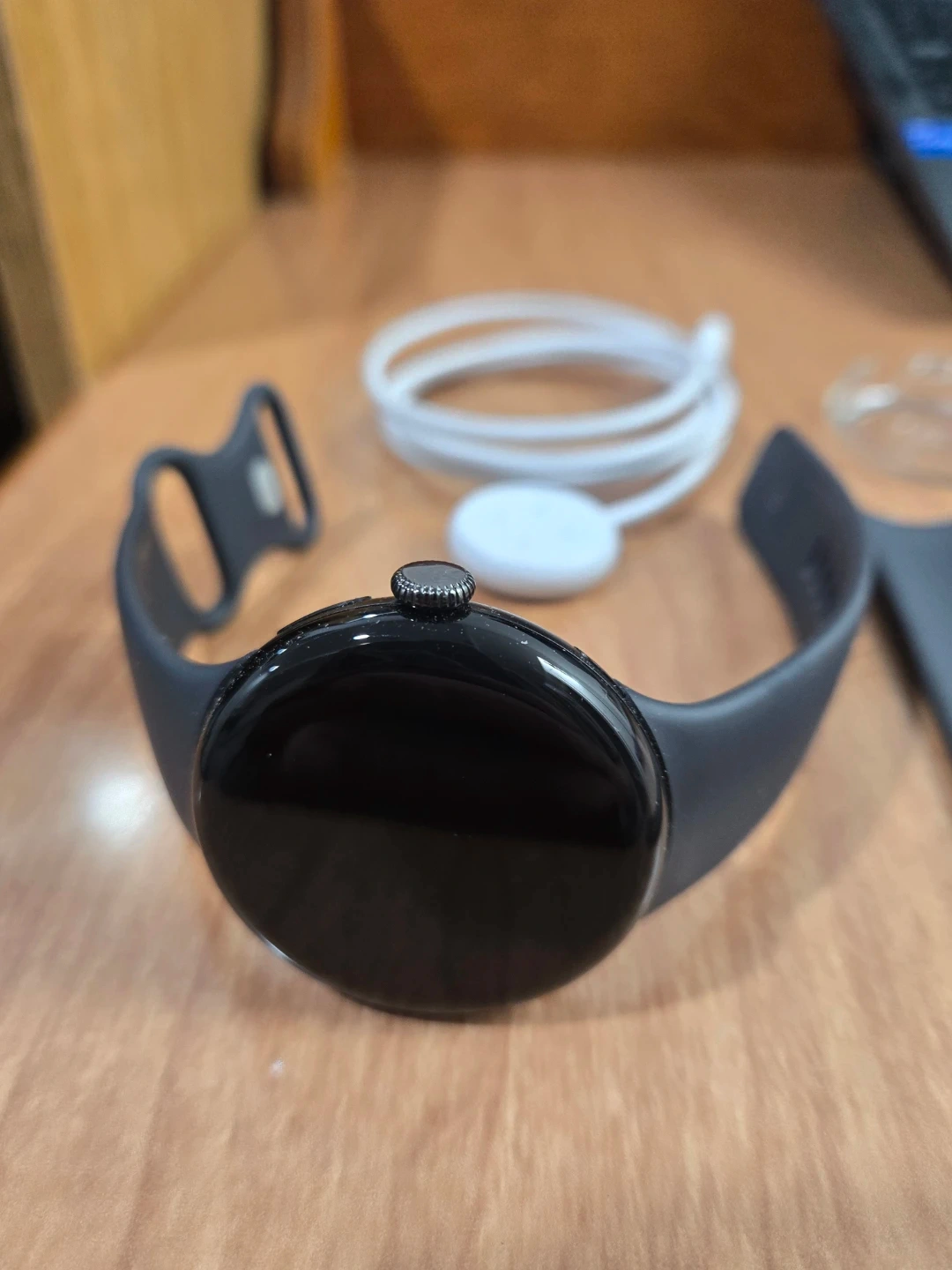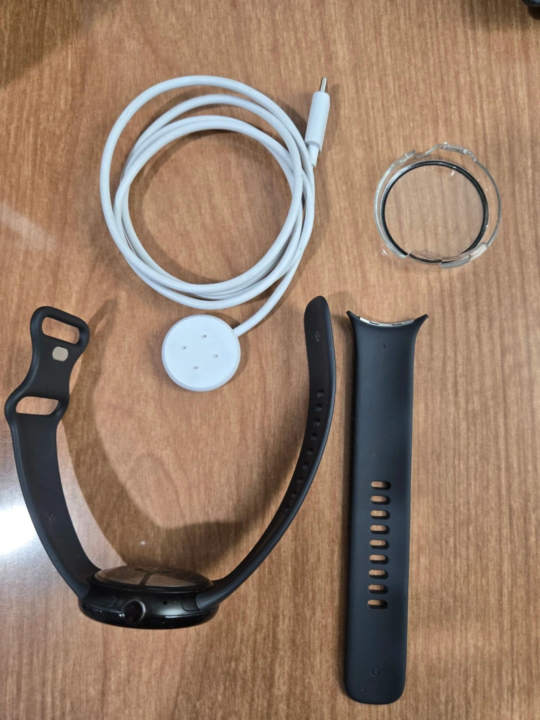 This is a black Google Pixel Watch 3 45 mm. It comes with a charging cable and extra band. Includes a clear protective bumper. Its in excellent condition good battery life and great features with Gemini ai and more .