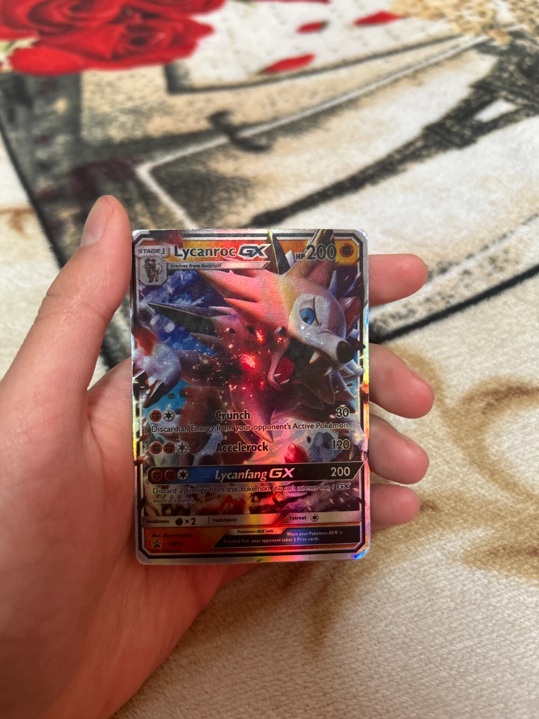 Two Pokémon GX trading cards included: Lycanroc GX and Dialga GX. These are collectible cards for the Pokémon Trading Card Game. Each card has unique attack and defense stats.