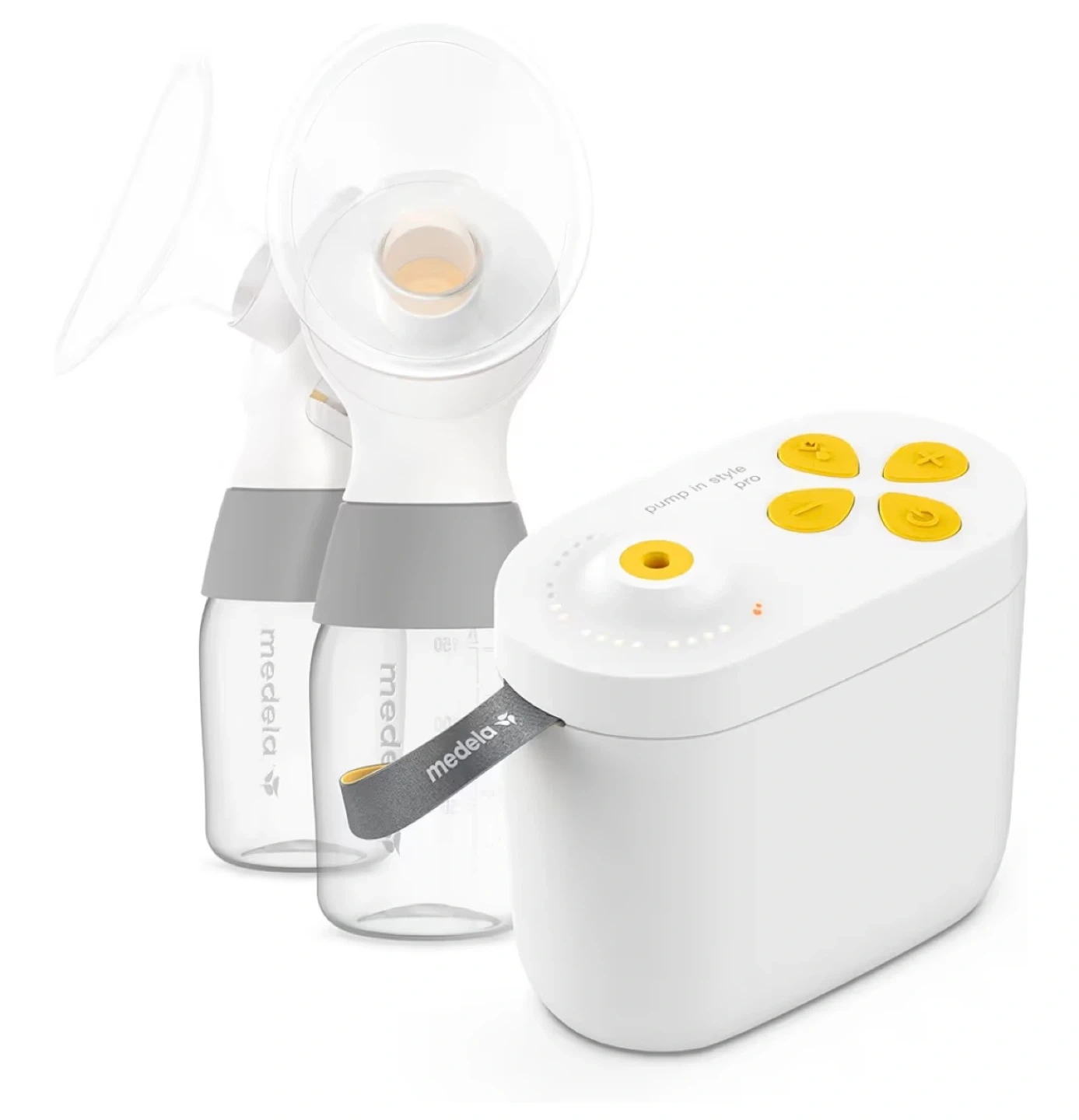 This is a Medela Pump in Style double electric breast pump. It includes two bottles and the main pump unit. The unit is white with yellow control buttons.