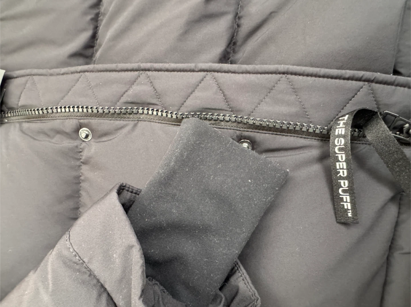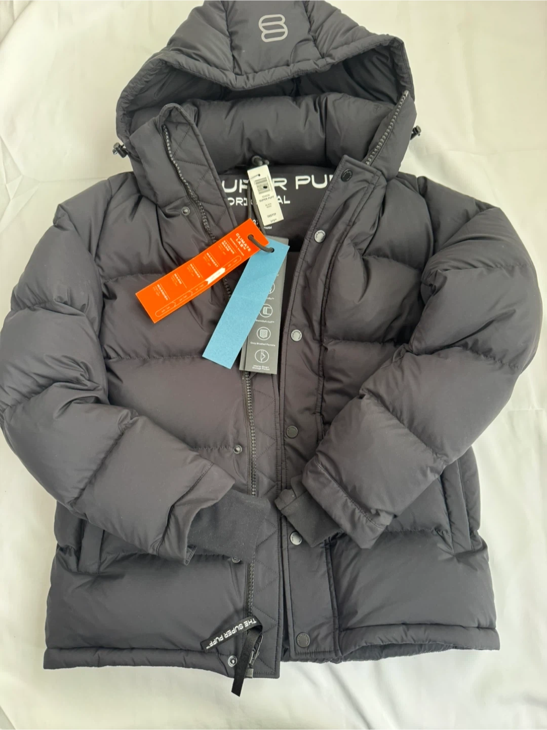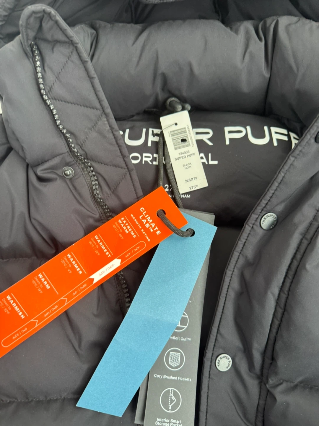 "The Super Puff" jacket is designed for cold weather, featuring 700+ fill power down for superior warmth. It's made with a water-resistant fabric. Cozy brushed pockets are included. This jacket is designed to keep you warm in temperatures as low as -25°C.