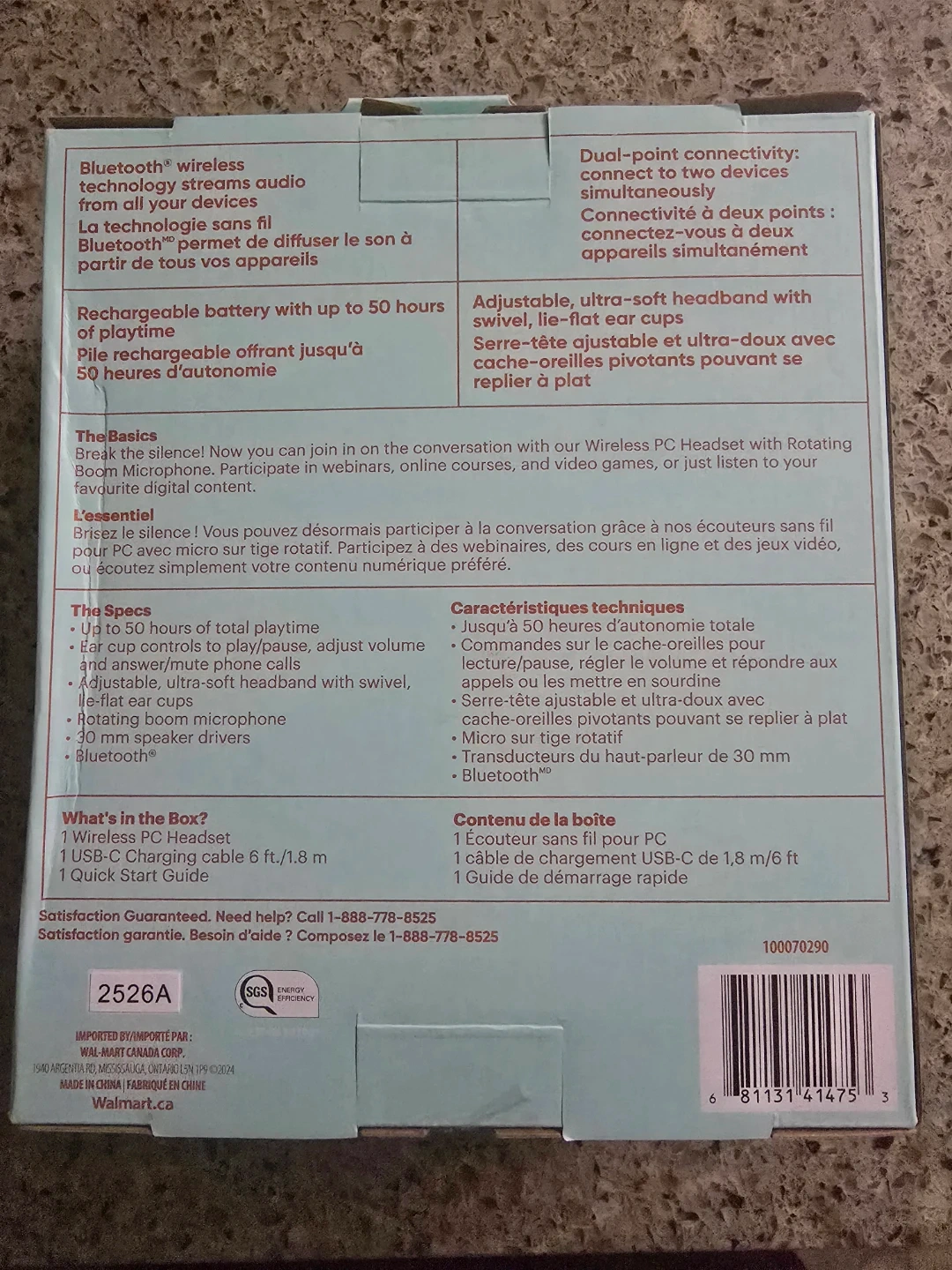 This Onn. wireless PC headset offers up to 50 hours of playtime and dual-point connectivity. It features adjustable, ultra-soft ear cups and a rotating boom microphone. Includes a USB-C charging cable and quick start guide.
