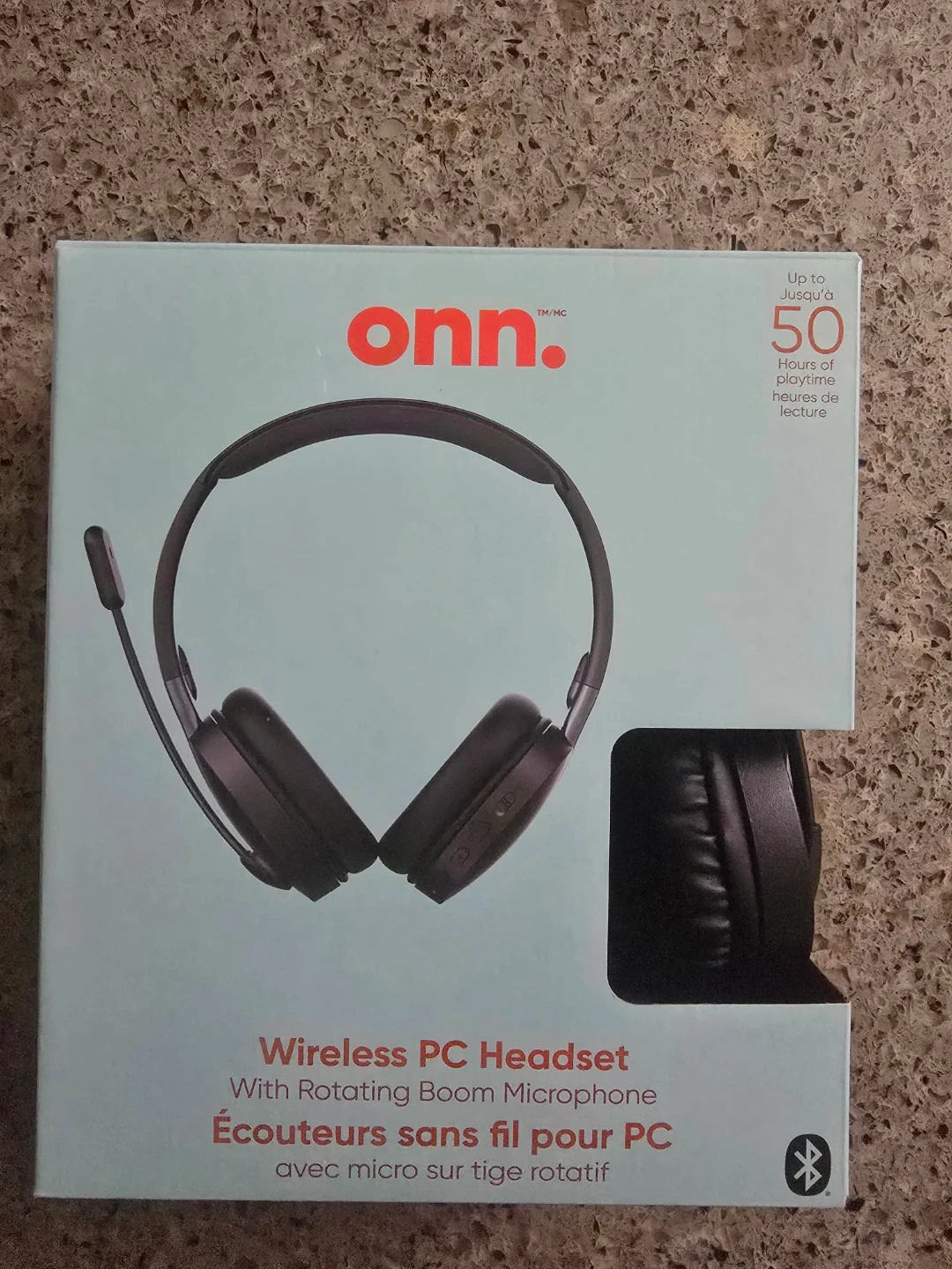 This Onn. wireless PC headset offers up to 50 hours of playtime and dual-point connectivity. It features adjustable, ultra-soft ear cups and a rotating boom microphone. Includes a USB-C charging cable and quick start guide.