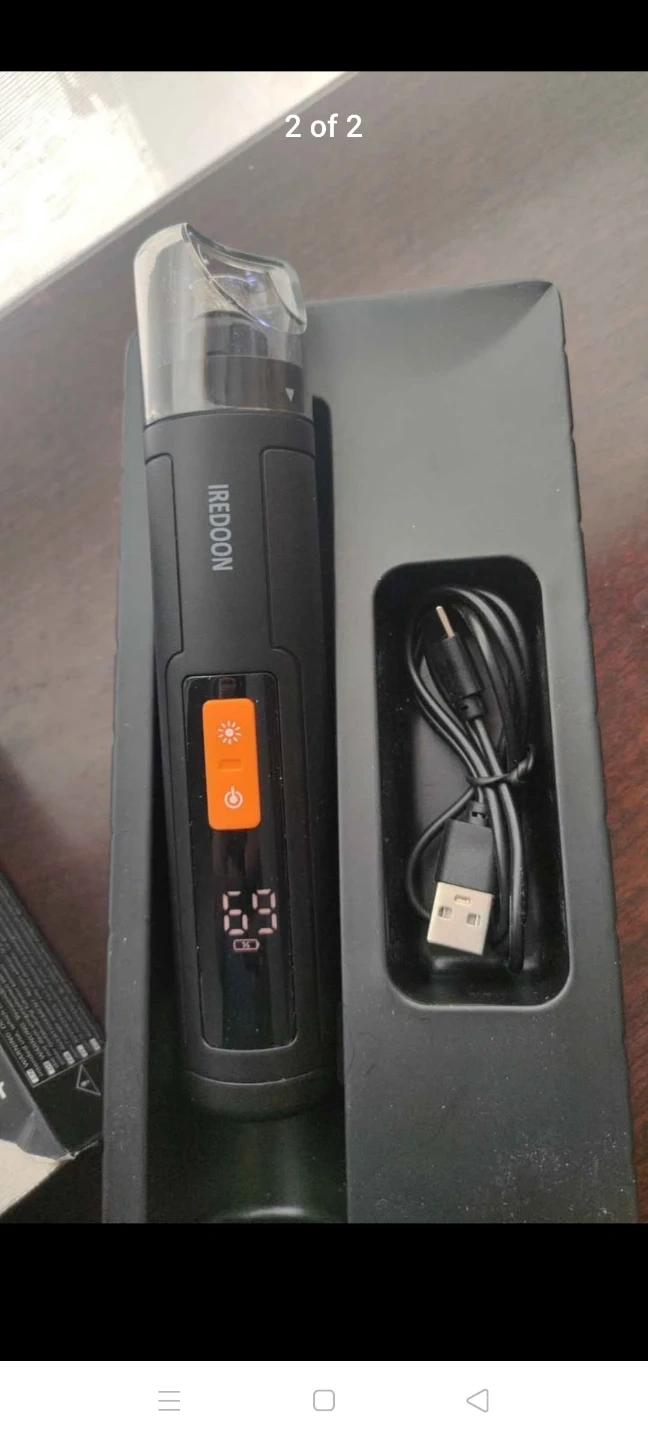 This is the Iredoon upgraded pet nail grinder. It features 4 LED lights to help with precision. The device is black and comes with a USB charging cable. It's a newer version for pet grooming.