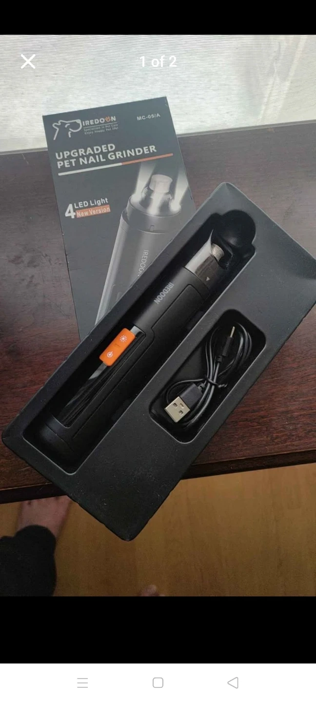 This is the Iredoon upgraded pet nail grinder. It features 4 LED lights to help with precision. The device is black and comes with a USB charging cable. It's a newer version for pet grooming.