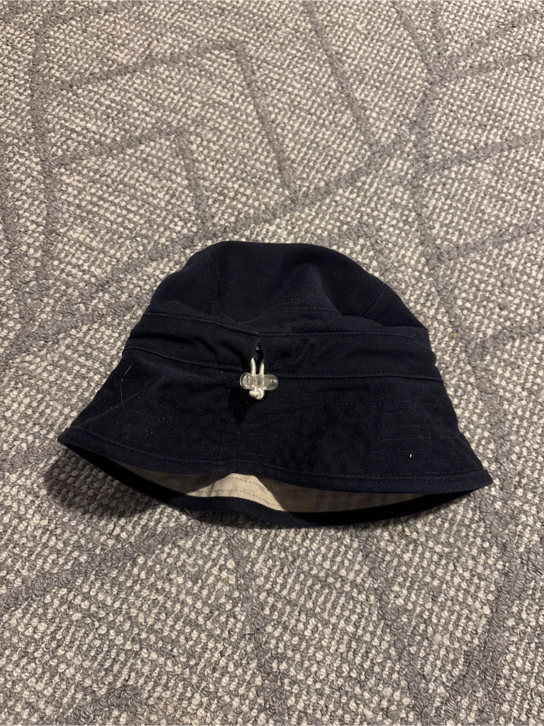 This is a dark blue bucket hat. It has a drawstring closure for adjustability. Fabric material.
