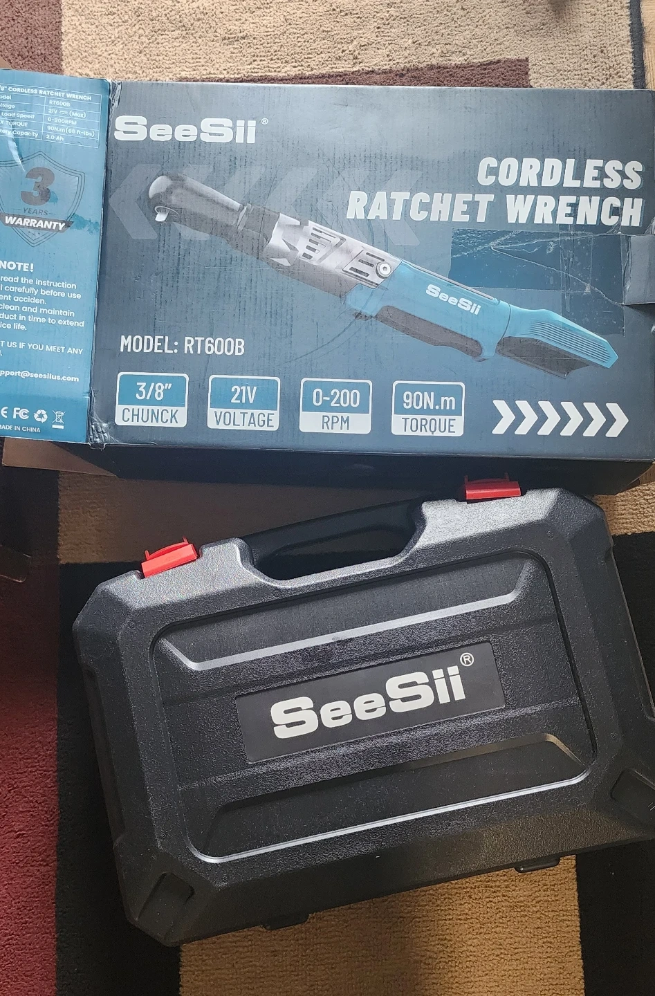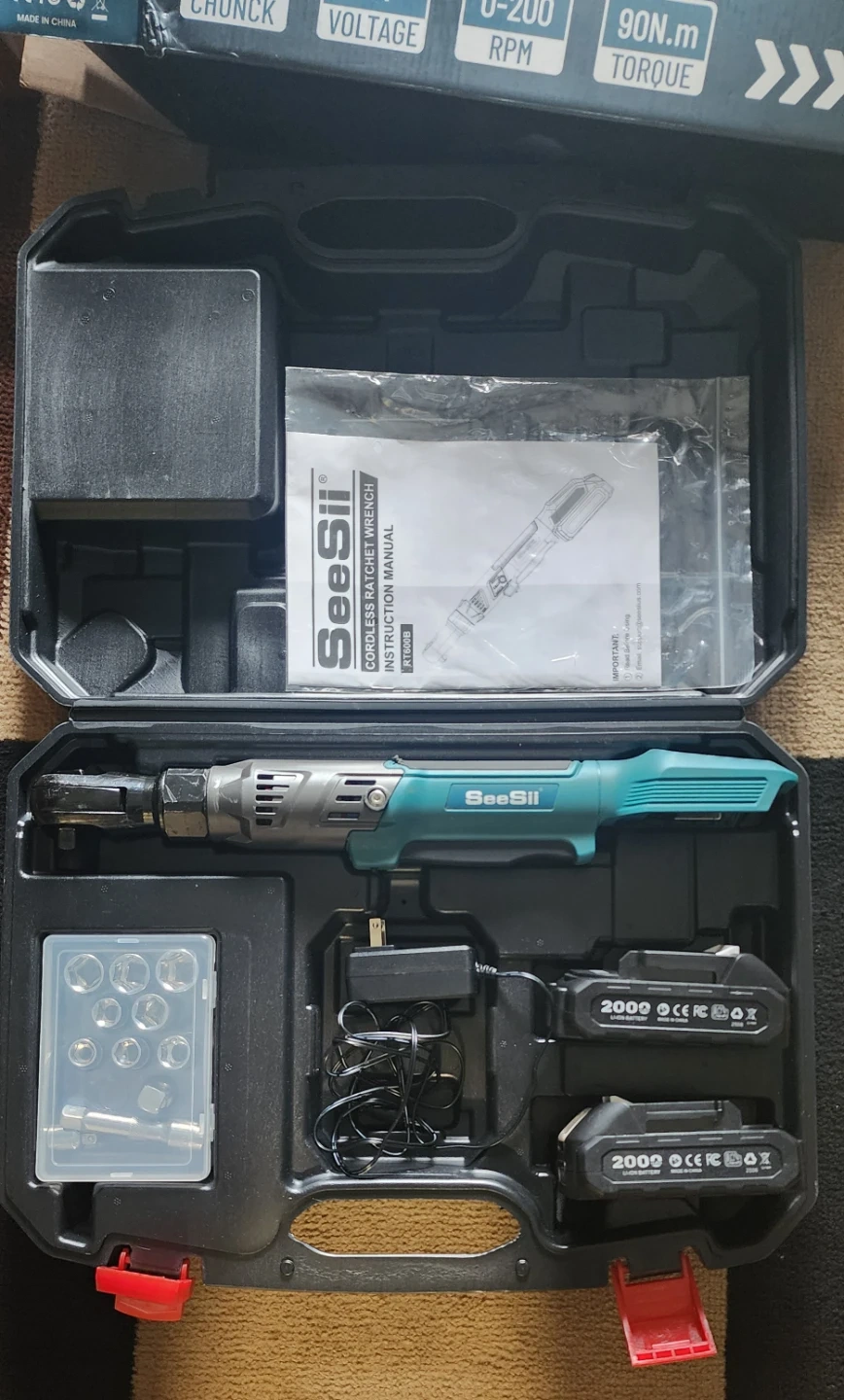 Selling a SeeSii cordless ratchet wrench kit, model RT600B. It includes two 20V batteries and a charger. The kit also comes with a manual and a set of sockets. This tool is useful for mechanics and DIYers working on automotive repairs or machinery assembly.