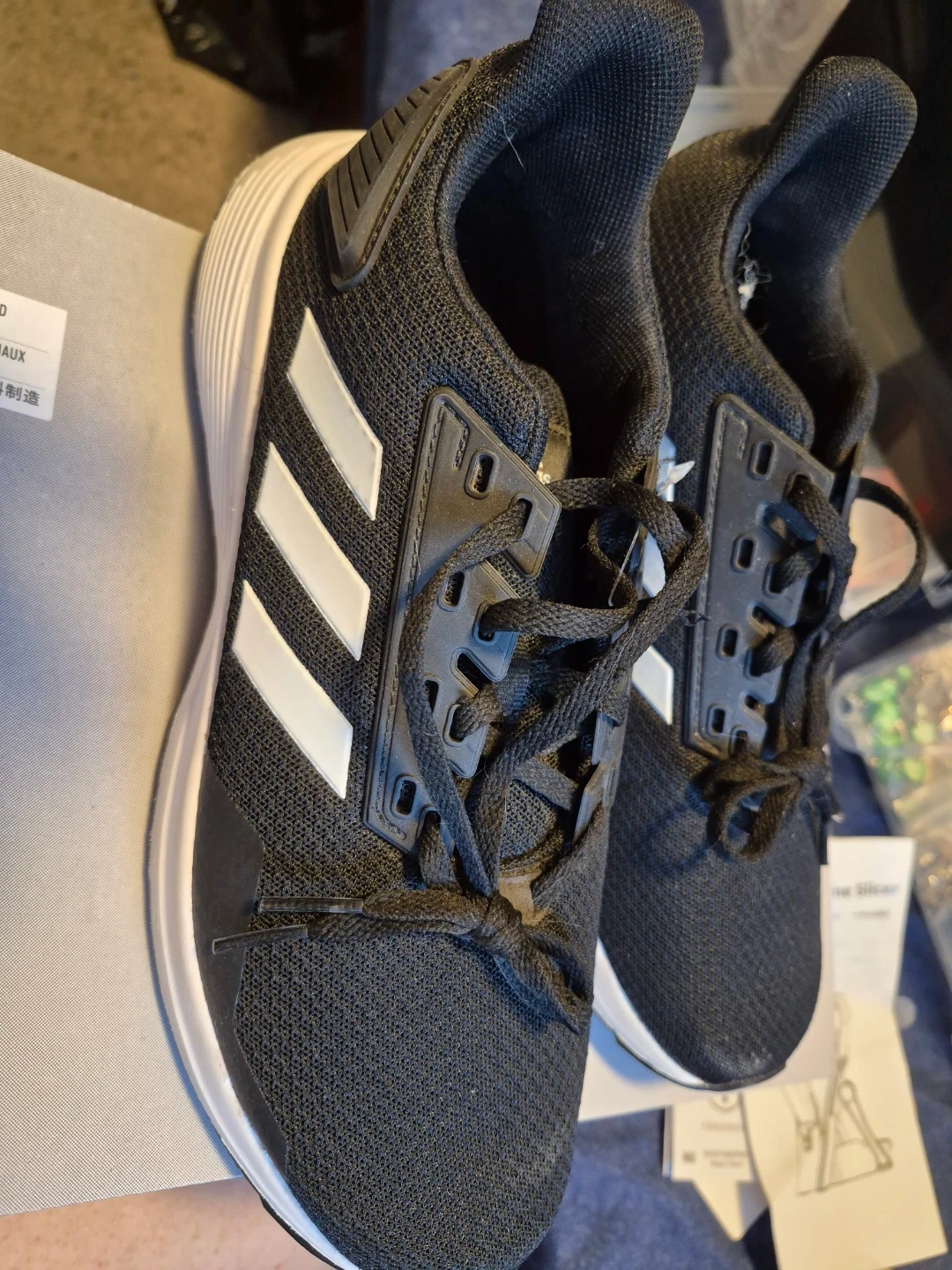 Black Adidas Questar running shoes. These shoes are size 8.5 US, 8 UK, 42 EU, and 265 J. They're designed for running and made in Indonesia.