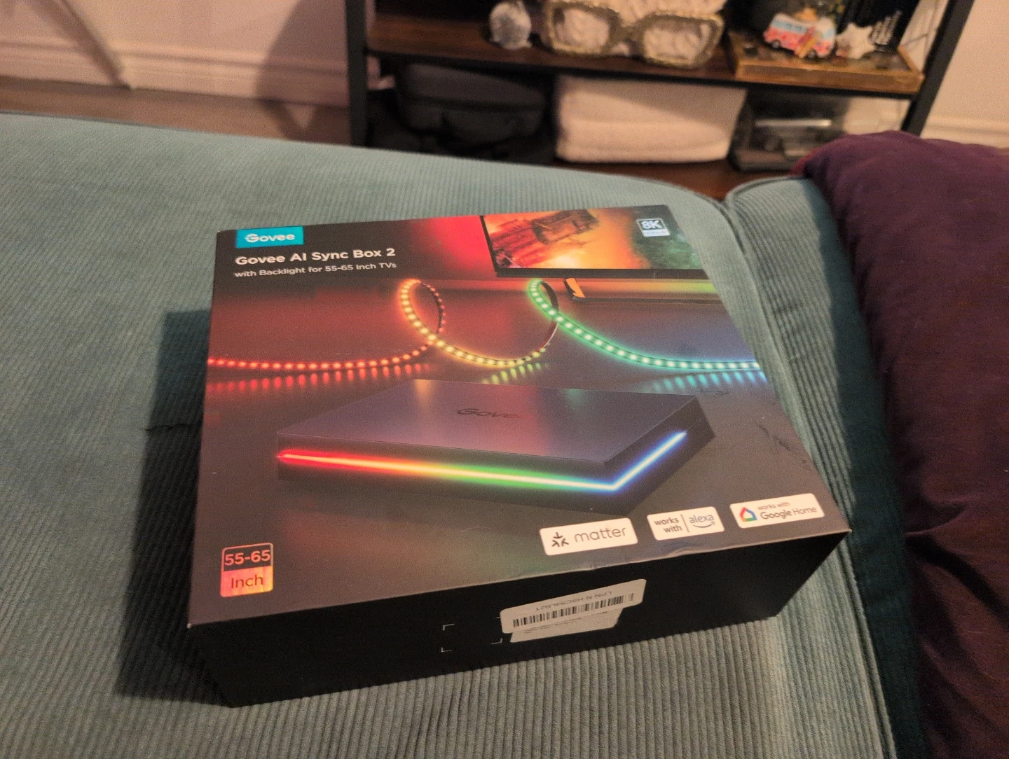 Govee AI Sync Box 2 is designed for 55-65 inch TVs. It supports 8K@60Hz and 4K@144Hz. This system works with Alexa, Google Home, and SmartThings. Includes original box and user manual.