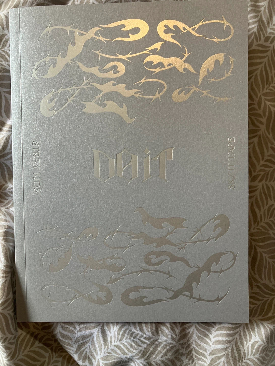 This is the SKZ-REPLAY 'SKZ-TAIPE' photo book from Stray Kids. It features a grey cover with embossed gold and silver designs. The inside pages contain artistic text and images.