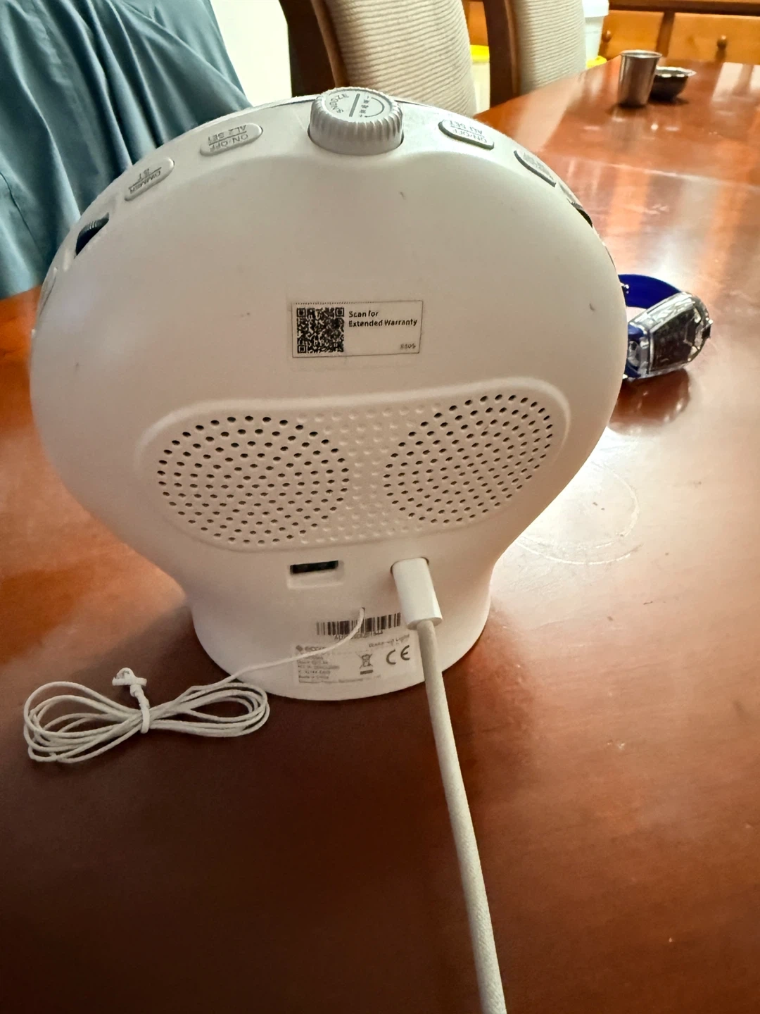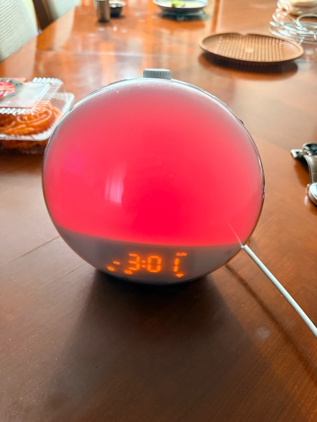 This sunrise alarm clock simulates a natural sunrise to wake you up. It offers multiple light colours and a digital display for the time. The device connects via USB for power.