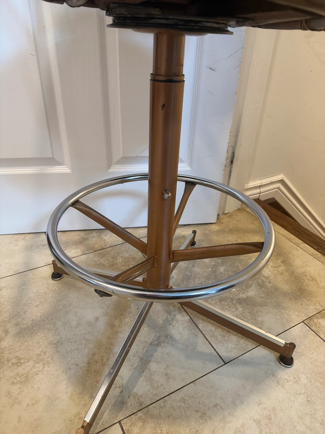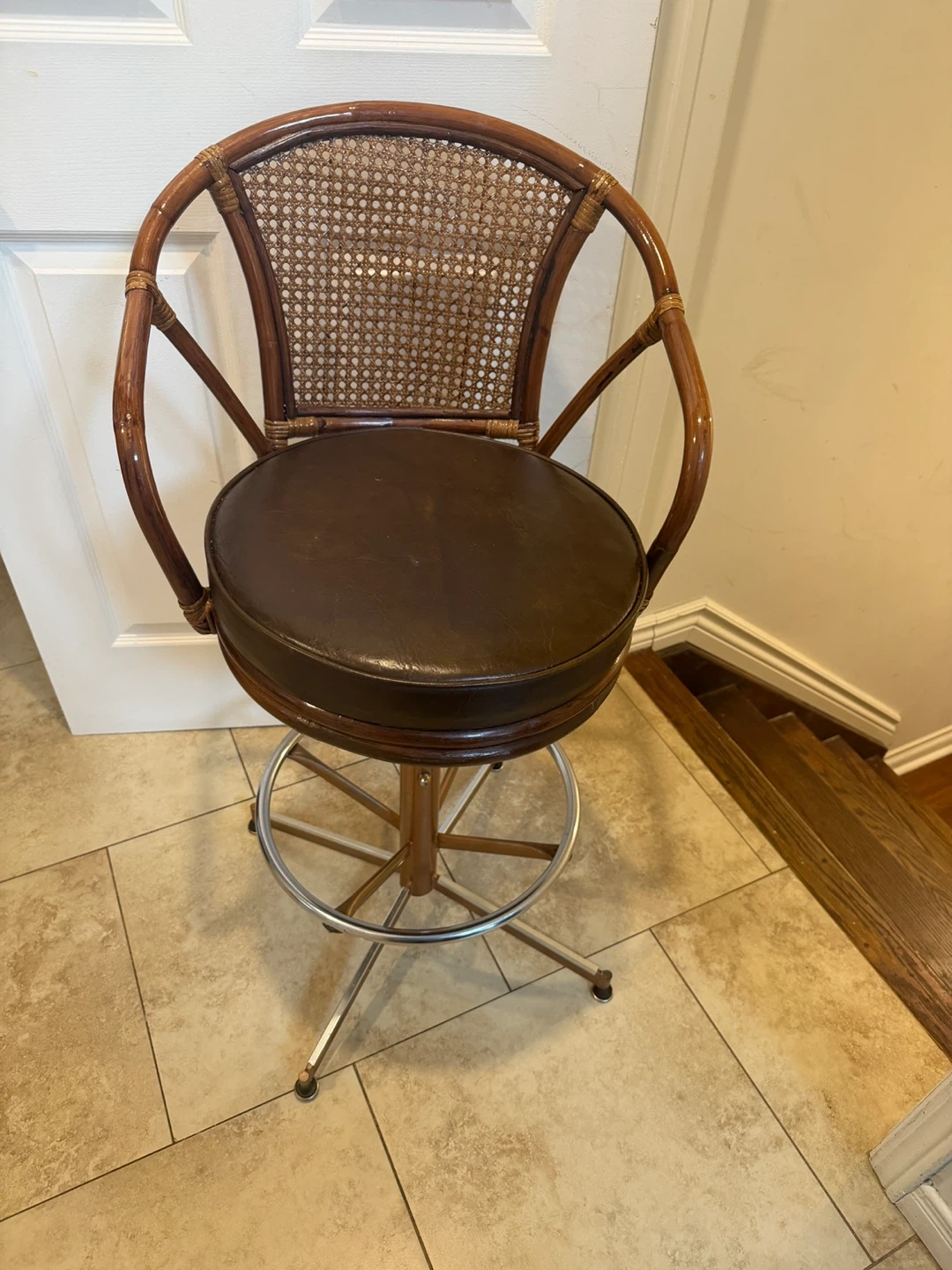 Four vintage swivel bar stools featuring a rattan back and brown faux leather seat. These chairs have a wooden frame with a metal footrest and adjustable height. They're perfect for a kitchen island or home bar setup!