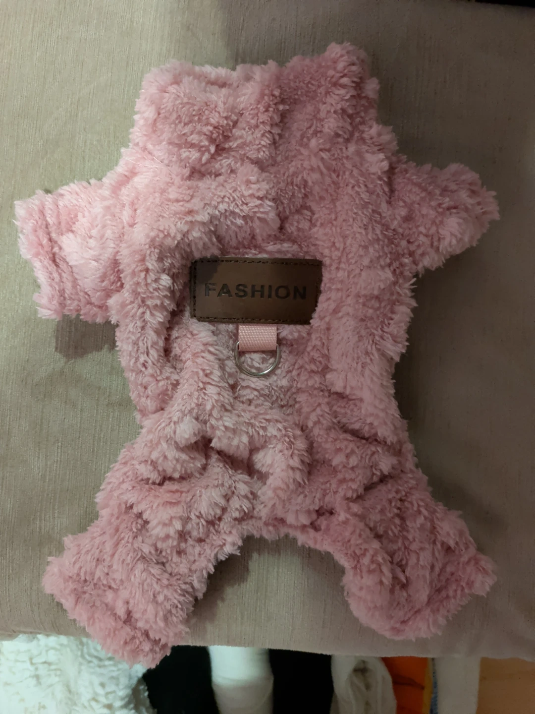 Super soft pink plush onesie for your furry friend. It's cozy and stylish, perfect for keeping them warm on chilly days. Comes with a built-in leash ring for convenience. Will fit Chihuahua or Pomeranian sized dog.