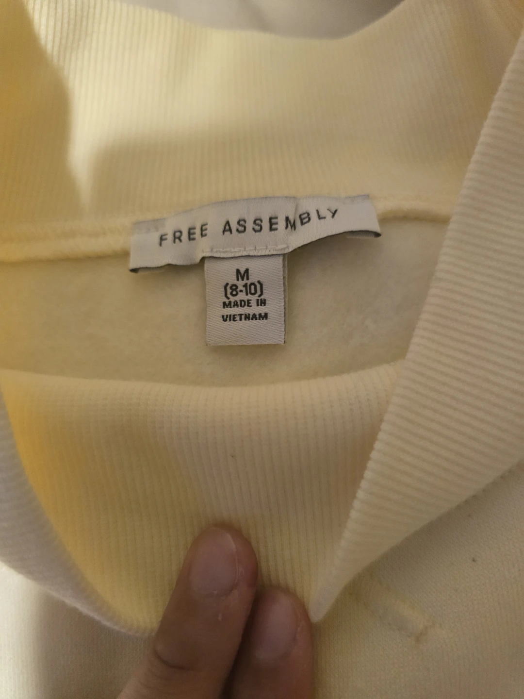 Selling a Free Assembly mock neck sweatshirt in size medium. The color is a soft yellow. It has a hole in the back. But was never used.