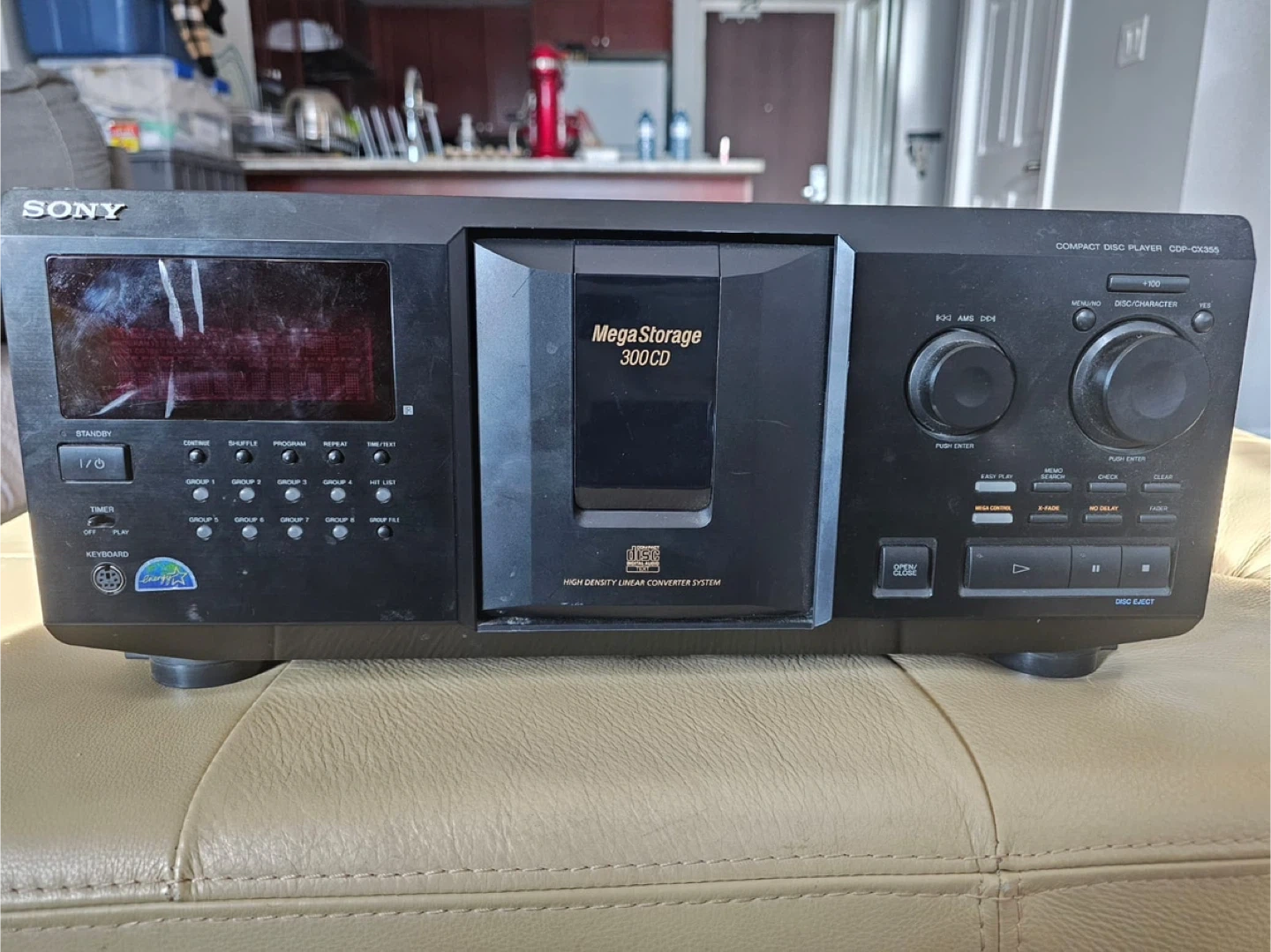 This is a Sony MegaStorage 300 CD player, model CDP-CX355. It's a high-density linear converter system. This unit is capable of storing and playing up to 300 CDs.