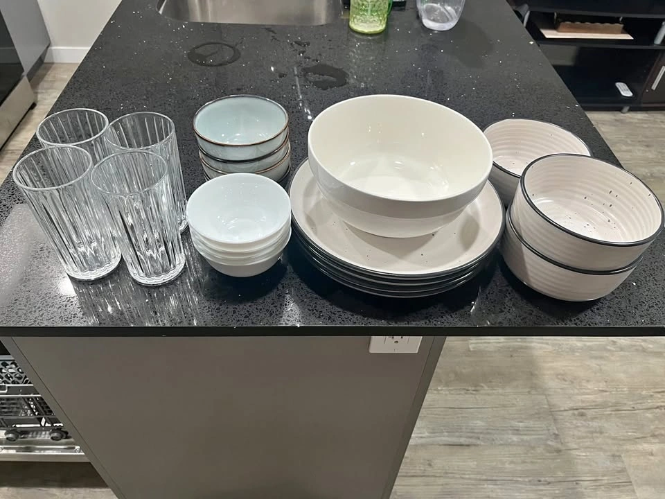 Selling a dinnerware set in very good condition. Perfect for a small family, students, or anyone setting up a new home. Includes: 4 ribbed glass drinking glasses, 4 small white Ikea bowls, 4 blue-grey Ikea bowls with brown rim, 4 white big stoneware bowls, 4 stoneware dinner plates, and 1 large white serving bowl. All items were bought 3 months ago and are gently used, clean, and well maintained. Modern, neutral design that matches any kitchen or dining setup. Selling for $30 as I am moving away.