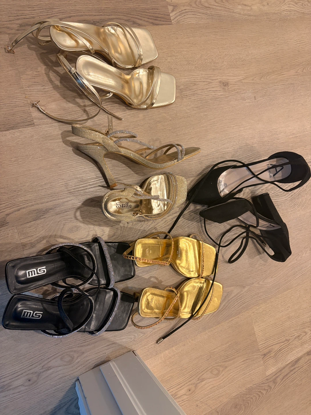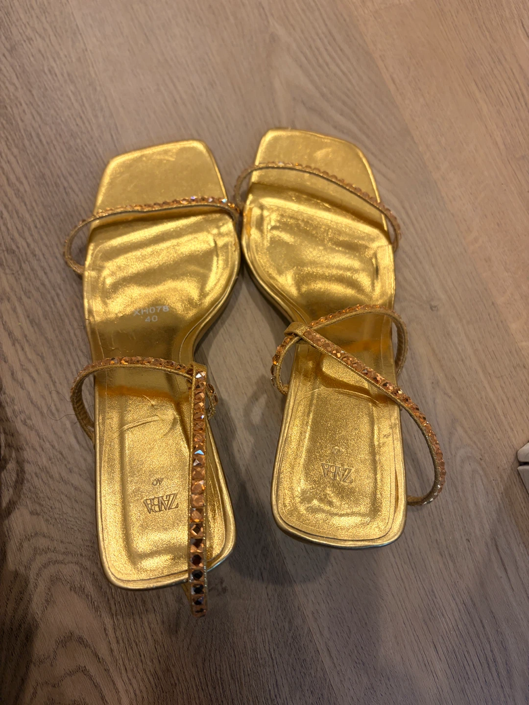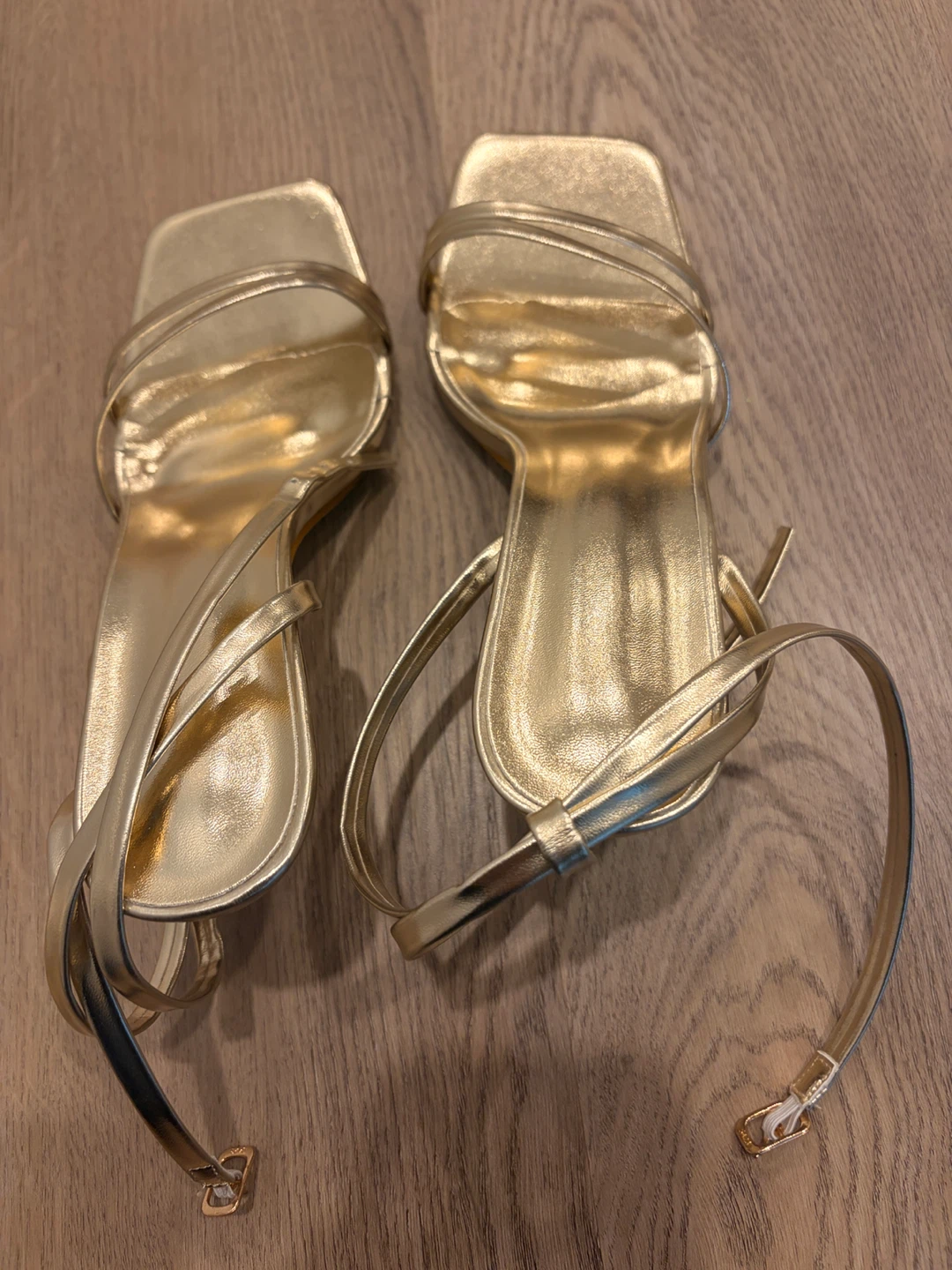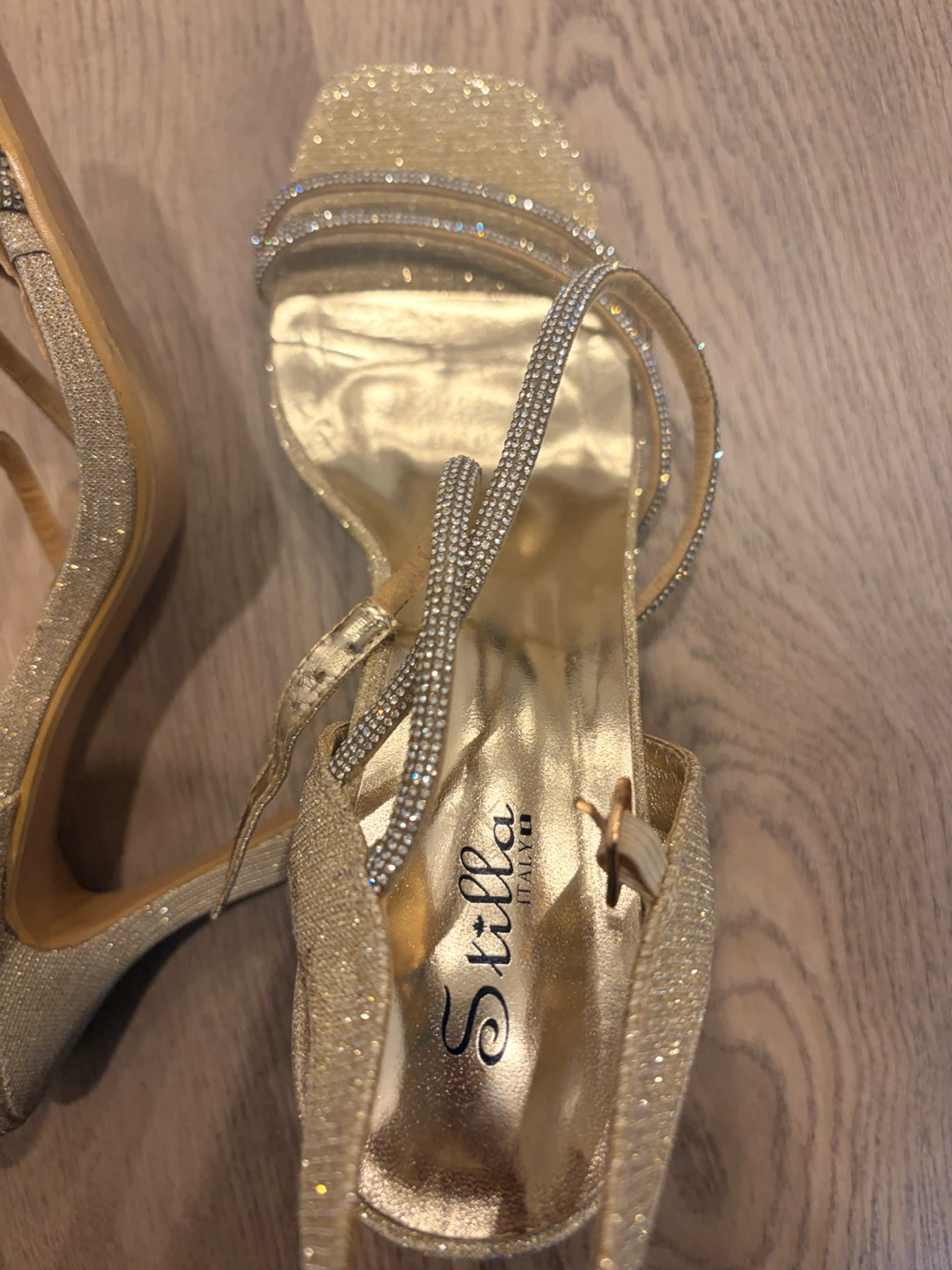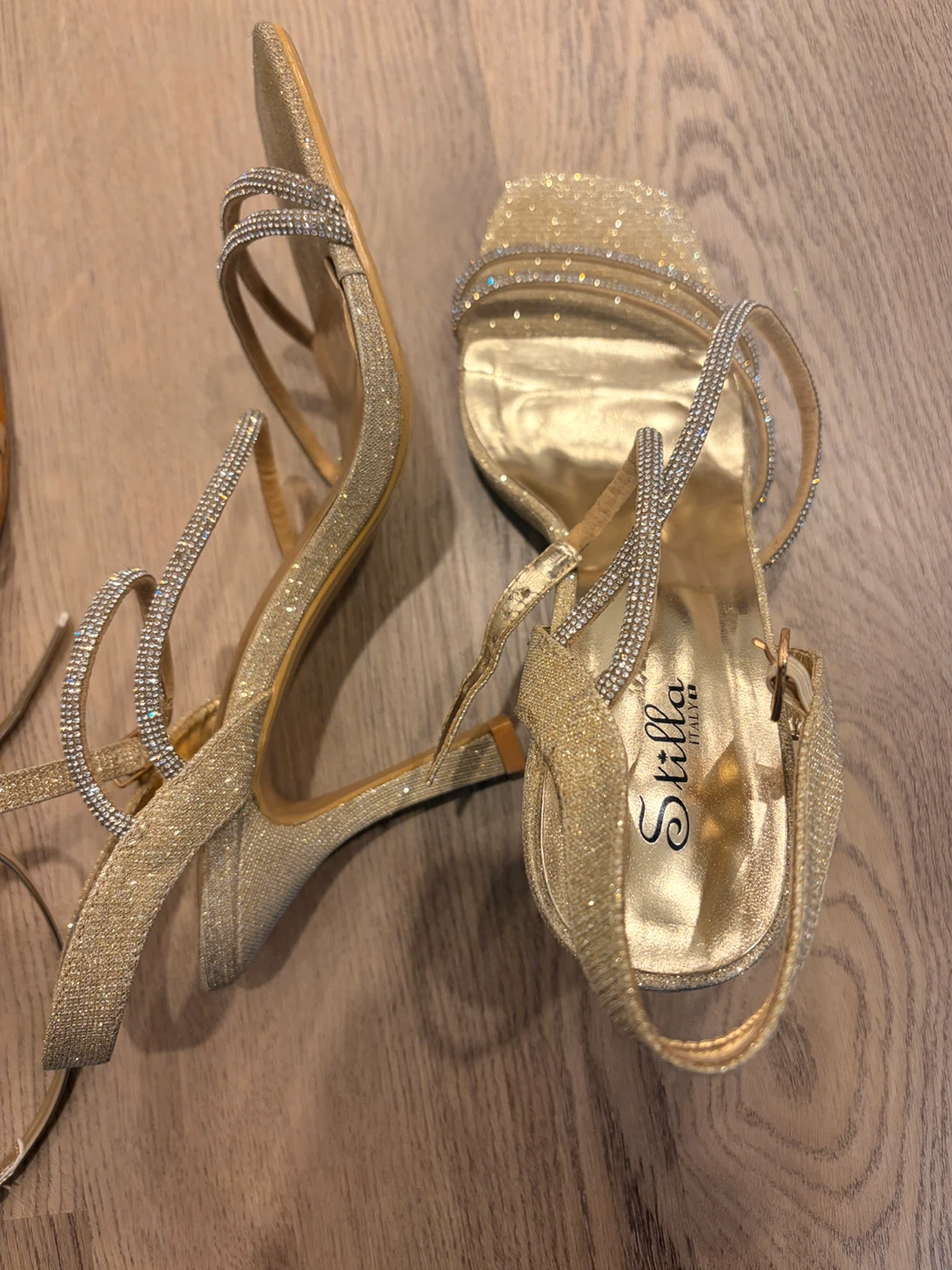 These Stilla Italy heeled sandals are a sparkling gold colour. They feature delicate straps with rhinestones and a buckle closure. Perfect for a special occasion! All for 60 cad