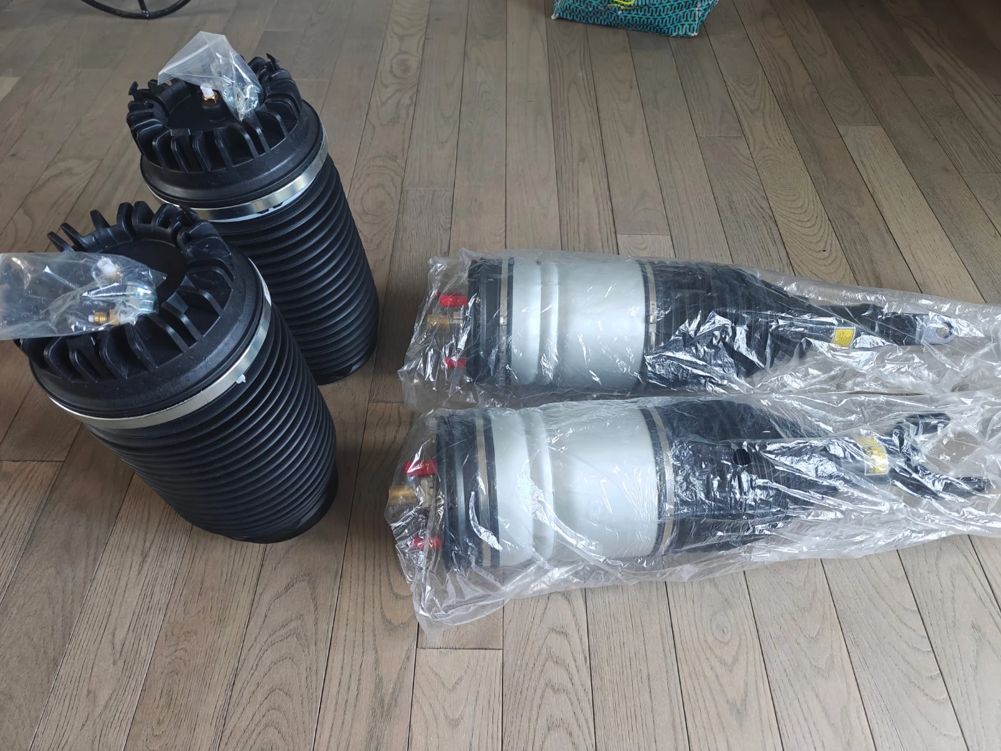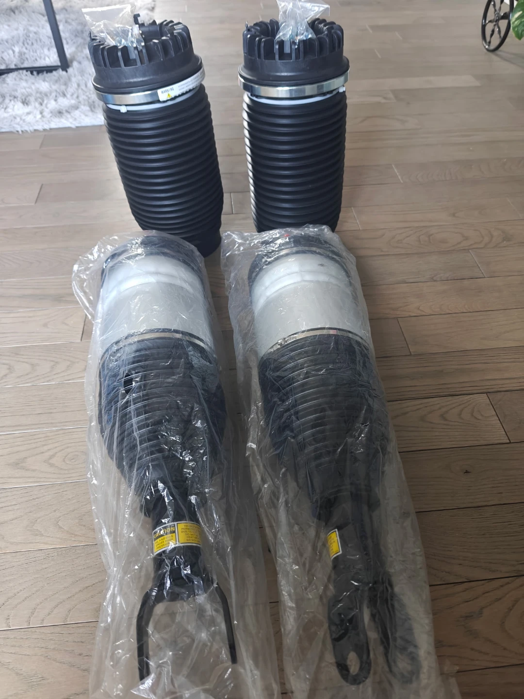 Set of four air suspension spring bellows and struts. Two larger bellows are black ribbed, and two smaller struts are silver and black. All are new and individually bagged.