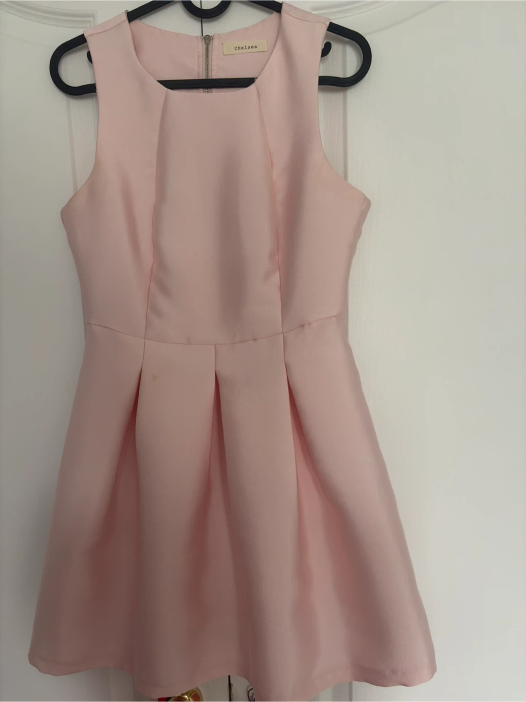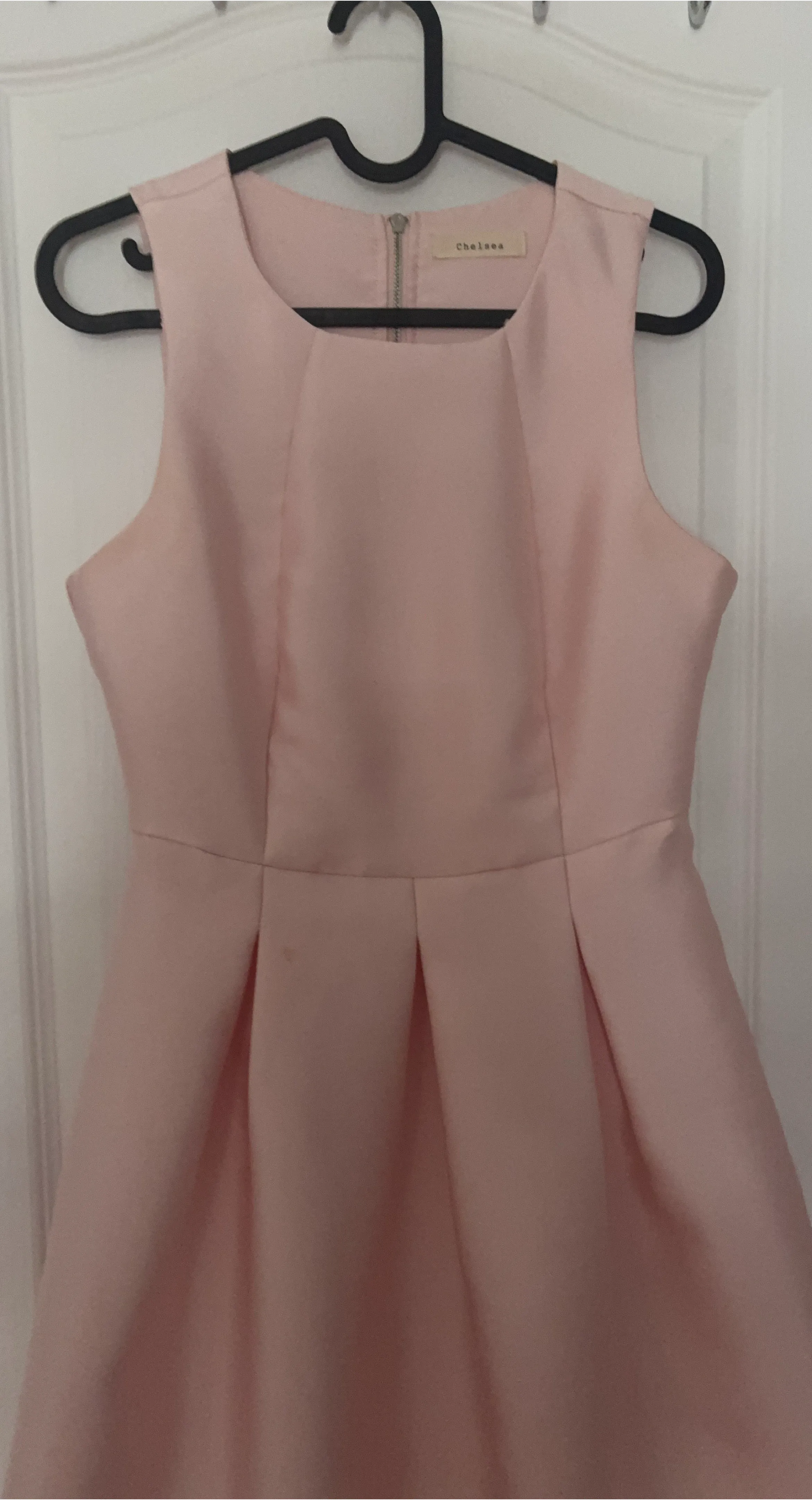 Cute pink sleeveless dress by Chelsea. It's a fit and flare style with pleats on the skirt. Zipper closure at the back. This dress is lovely for a party or special occasion!