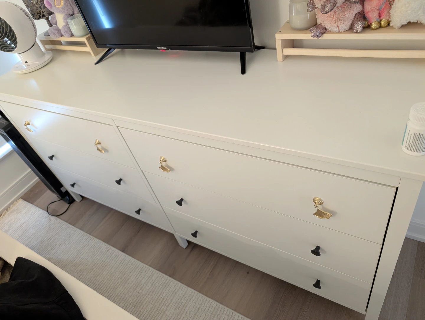 Selling a gently used IKEA Hemnes dresser in white! It features 6 spacious drawers, perfect for organizing your clothes and other belongings. The dresser has unique ginkgo leaf drawer pulls, adding a touch of elegance to your space. A great addition to any bedroom or living area!