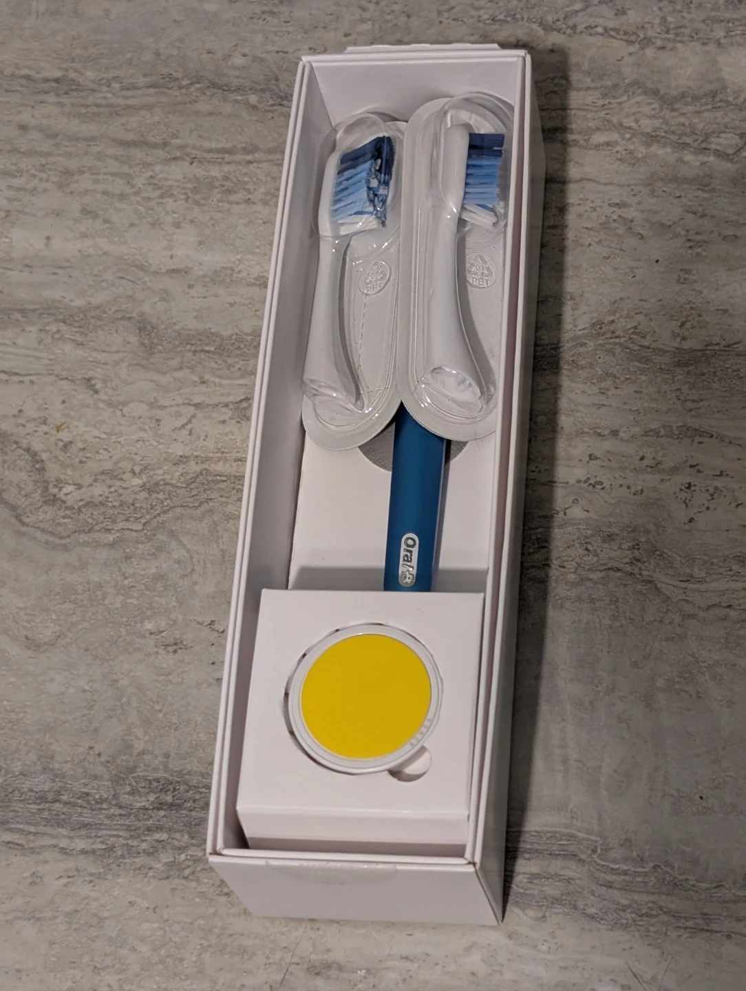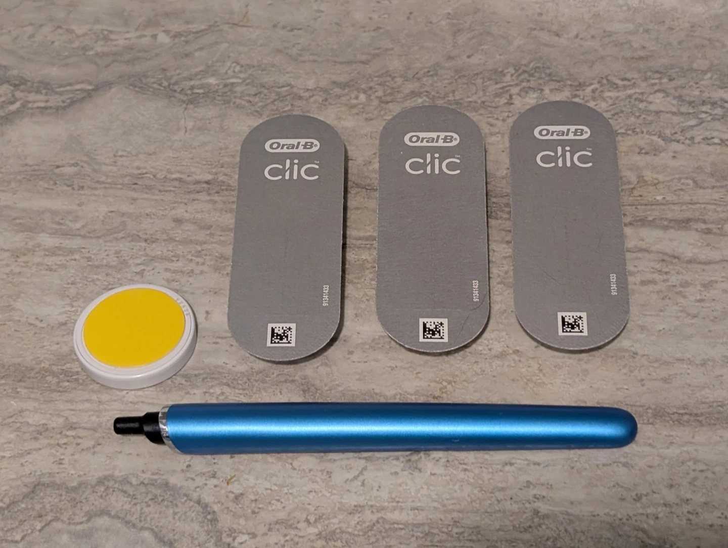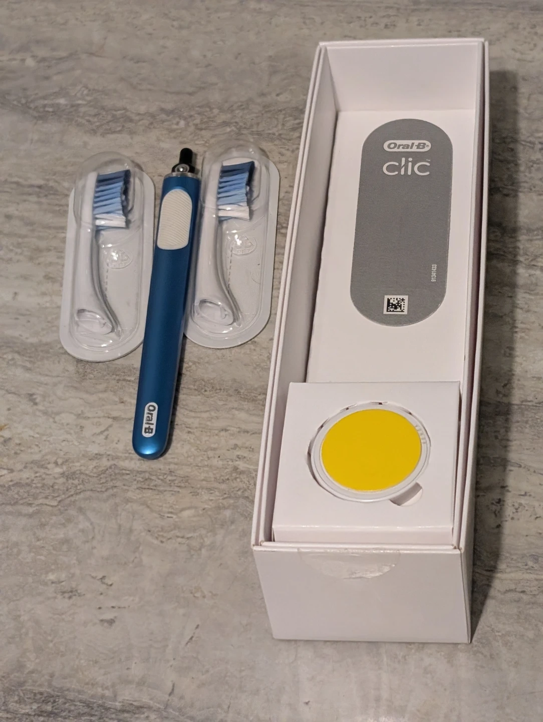 Selling an Oral-B Clic toothbrush, lovely blue and white, with medium-bristled brush heads.