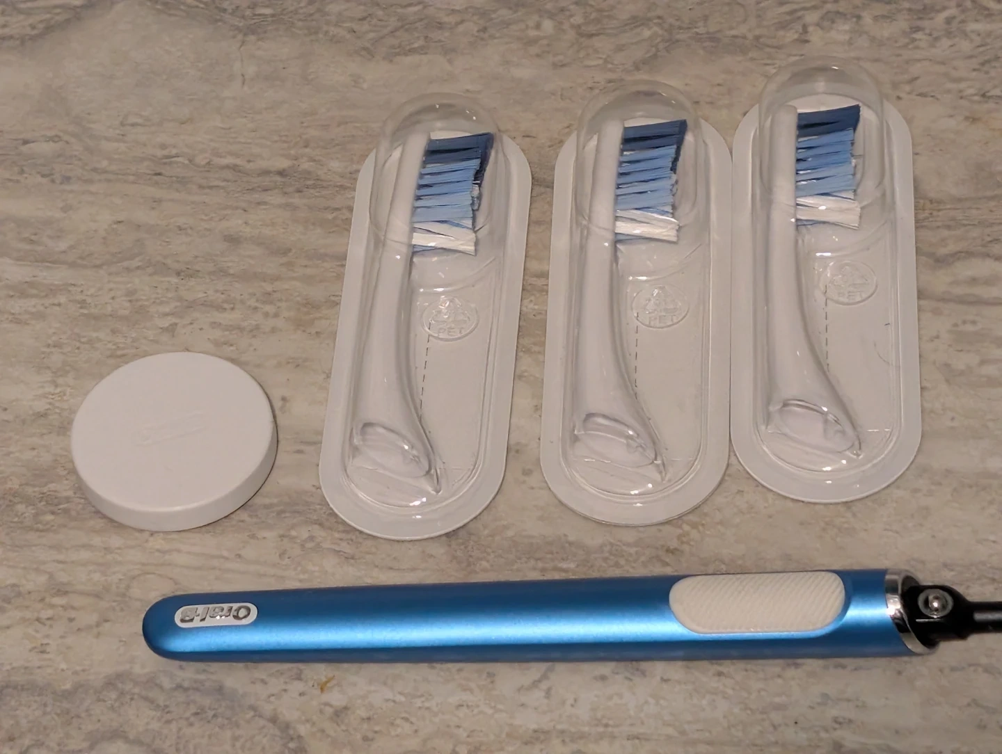 It comes with the metal handle, three brand-new never-opened brush heads, a never-used magnetic wall mount sticker, and the box it all came in.